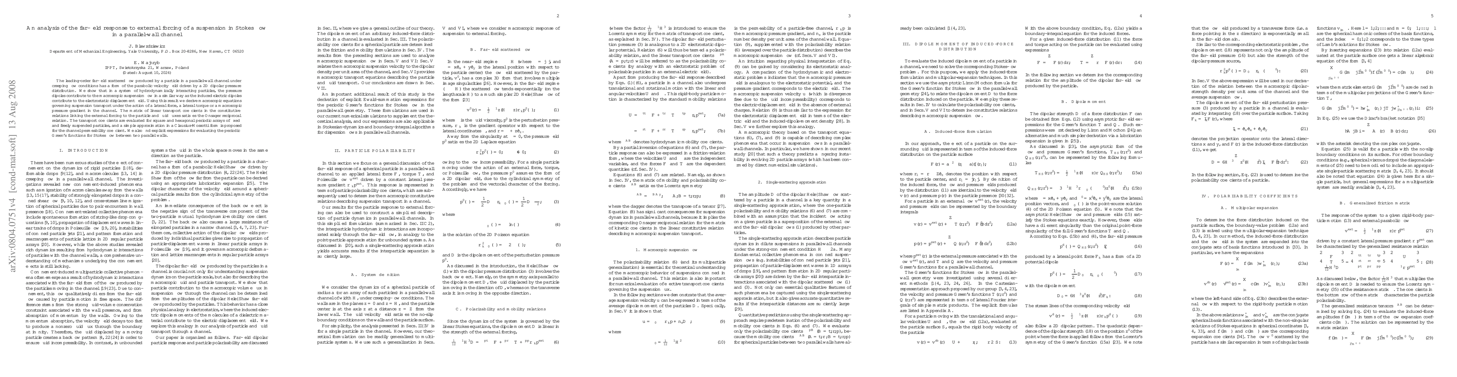 This paper analyzes the far-field response of a suspension in Stokes flow within a parallel-wall channel, showing that pressure dipoles from interacting particles influence the macroscopic flow similarly to electric dipoles in electrostatics. It derives macroscopic transport equations and evaluates transport coefficients for different particle arrangements, proposing a Clausius-Mossotti form approximation for permeability.