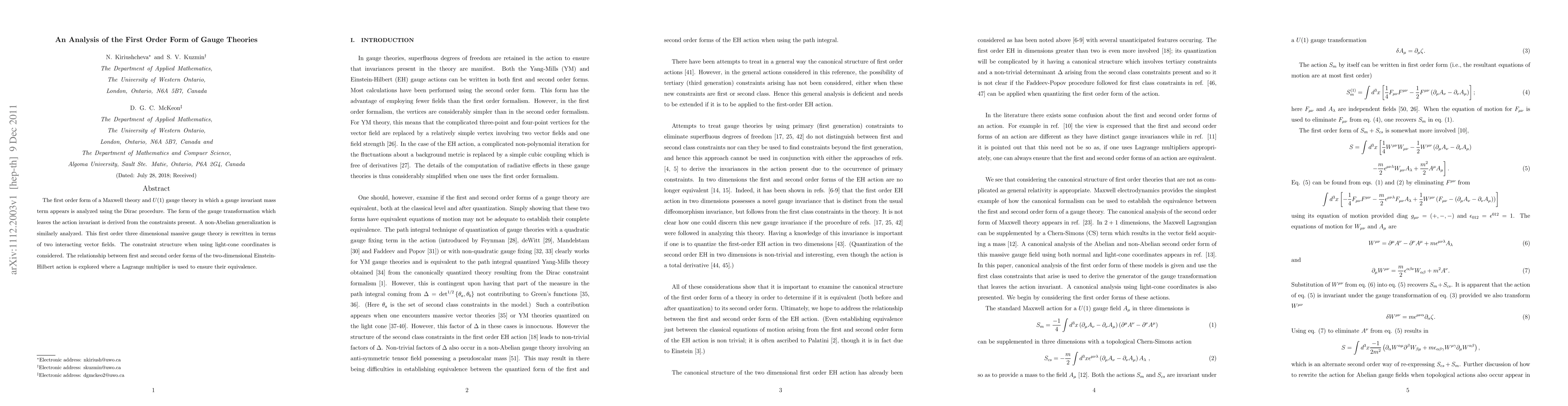 The first order form of a Maxwell theory and U(1) gauge theory in which a gauge invariant mass term appears is analyzed using the Dirac procedure. The form of the gauge transformation which leaves the action invariant is derived from the constraints present. A non-Abelian generalization is similarly analyzed. This first order three dimensional massive gauge theory is rewritten in terms of two interacting vector fields. The constraint structure when using light-cone coordinates is considered. The relationship between first and second order forms of the two-dimensional Einstein-Hilbert action is explored where a Lagrange multiplier is used to ensure their equivalence.