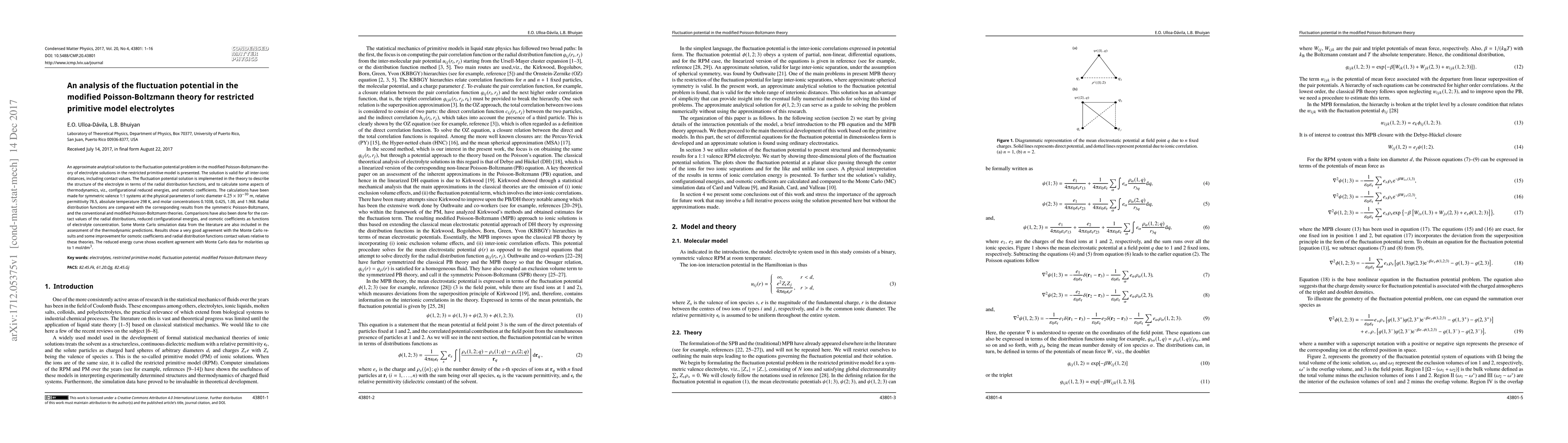 An approximate analytical solution to the fluctuation potential problem in the modified Poisson-Boltzmann theory of electrolyte solutions in the restricted primitive model is presented. The solution is valid for all inter-ionic distances, including contact values. The fluctuation potential solution is implemented in the theory to describe the structure of the electrolyte in terms of the radial distribution functions, and to calculate some aspects of thermodynamics, viz., configurational reduced energies, and osmotic coefficients. The calculations have been made for symmetric valence 1:1 systems at the physical parameters of ionic diameter $4.25 \times 10^{-10}$ m, relative permittivity 78.5, absolute temperature 298 K, and molar concentrations 0.1038, 0.425, 1.00, and 1.968. Radial distribution functions are compared with the corresponding results from the symmetric Poisson-Boltzmann, and the conventional and modified Poisson-Boltzmann theories. Comparisons have also been done for the contact values of the radial distributions, reduced configurational energies, and osmotic coefficients as functions of electrolyte concentration. Some Monte Carlo simulation data from the literature are also included in the assessment of the thermodynamic predictions. Results show a very good agreement with the Monte Carlo results and some improvement for osmotic coefficients and radial distribution functions contact values relative to these theories. The reduced energy curve shows excellent agreement with Monte Carlo data for molarities up to 1 mol/dm$^{3}$.