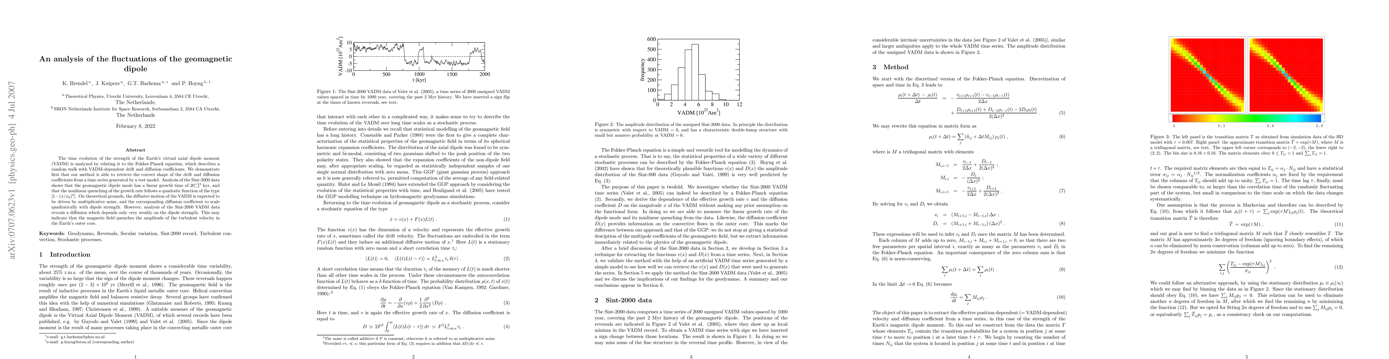 The time evolution of the strength of the Earth's virtual axial dipole moment (VADM) is analyzed by relating it to the Fokker-Planck equation, which describes a random walk with VADM-dependent drift and diffusion coefficients. We demonstrate first that our method is able to retrieve the correct shape of the drift and diffusion coefficients from a time series generated by a test model. Analysis of the Sint-2000 data shows that the geomagnetic dipole mode has a linear growth time of 13 to 33 kyr, and that the nonlinear quenching of the growth rate follows a quadratic function of the type [1-(x/x0)^2]. On theoretical grounds, the diffusive motion of the VADM is expected to be driven by multiplicative noise, and the corresponding diffusion coefficient to scale quadratically with dipole strength. However, analysis of the Sint-2000 VADM data reveals a diffusion which depends only very weakly on the dipole strength. This may indicate that the magnetic field quenches the amplitude of the turbulent velocity in the Earth's outer core.