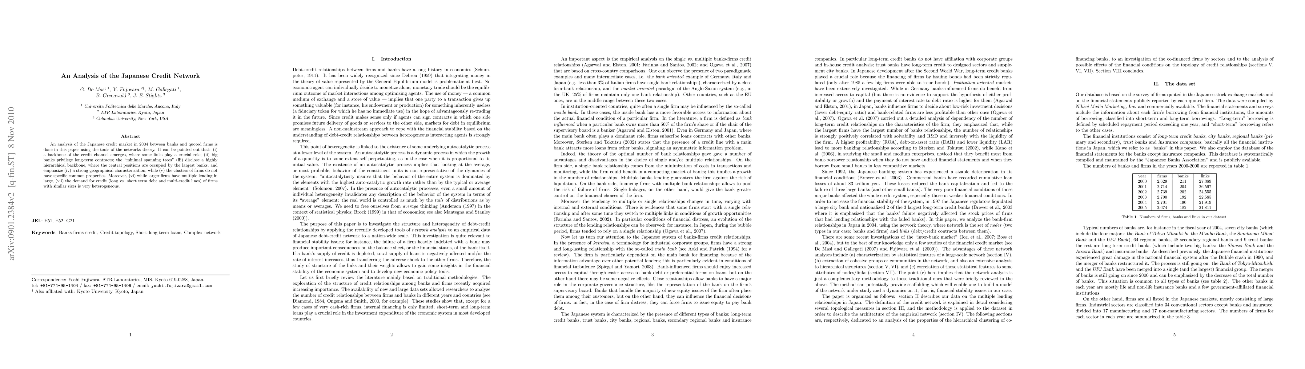 An analysis of the Japanese credit market in 2004 between banks and quoted firms is done in this paper using the tools of the networks theory. It can be pointed out that: (i) a backbone of the credit channel emerges, where some links play a crucial role; (ii) big banks privilege long-term contracts; the "minimal spanning trees" (iii) disclose a highly hierarchical backbone, where the central positions are occupied by the largest banks, and emphasize (iv) a strong geographical characterization, while (v) the clusters of firms do not have specific common properties. Moreover, (vi) while larger firms have multiple lending in large, (vii) the demand for credit (long vs. short term debt and multi-credit lines) of firms with similar sizes is very heterogeneous.