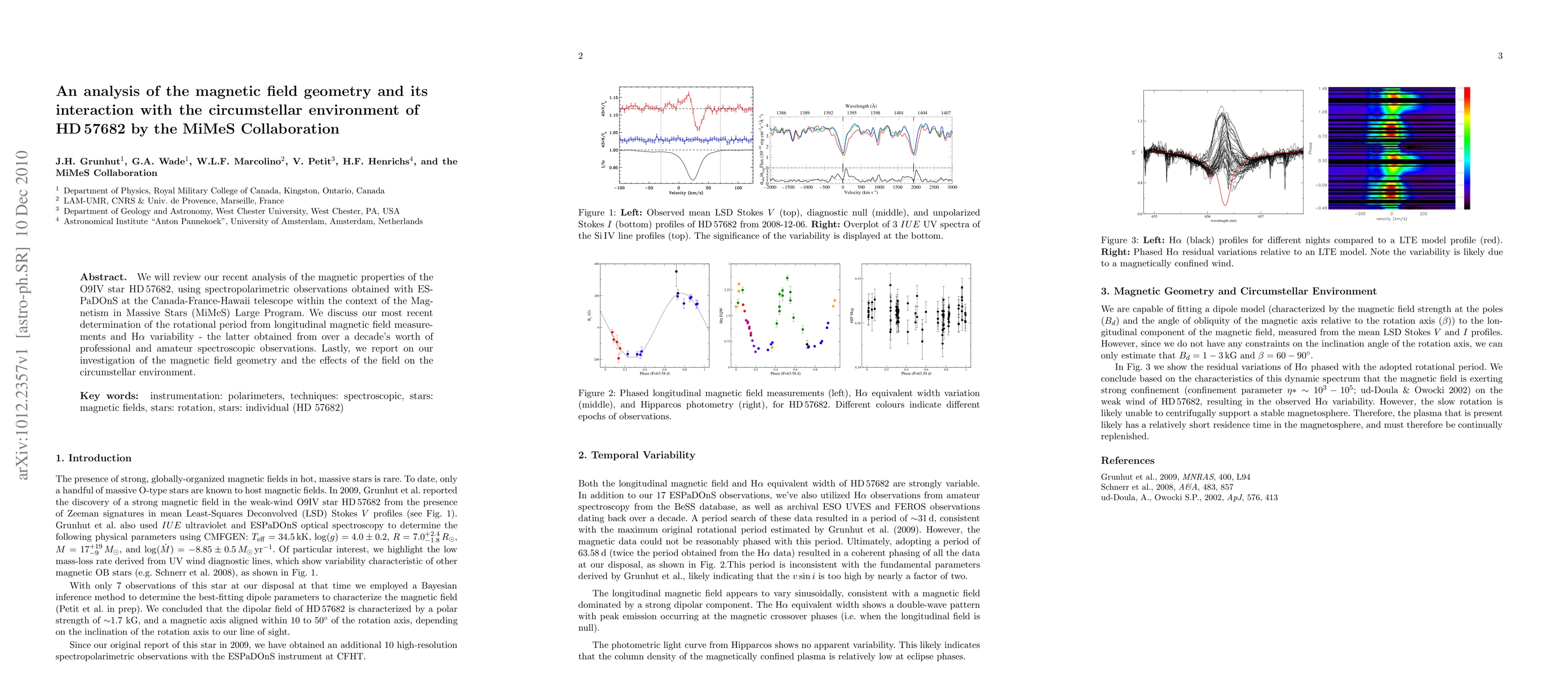 We will review our recent analysis of the magnetic properties of the O9IV star HD 57682, using spectropolarimetric observations obtained with ESPaDOnS at the Canada-France-Hawaii telescope within the context of the Magnetism in Massive Stars (MiMeS) Large Program. We discuss our most recent determination of the rotational period from longitudinal magnetic field measurements and H_alpha variability - the latter obtained from over a decade's worth of professional and amateur spectroscopic observations. Lastly, we report on our investigation of the magnetic field geometry and the effects of the field on the circumstellar environment.