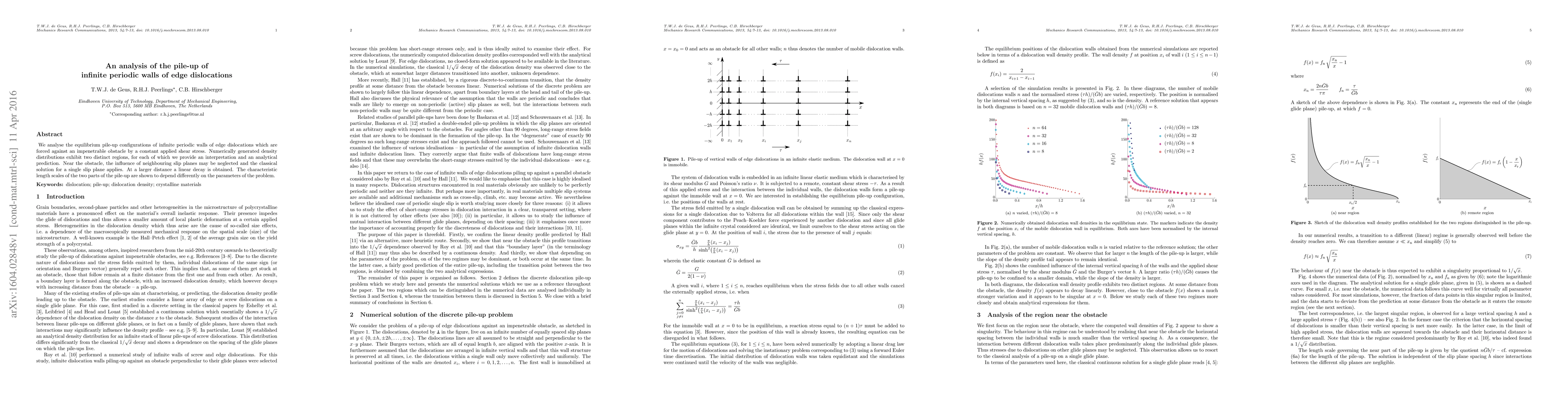 We analyse the equilibrium pile-up configurations of infinite periodic walls of edge dislocations which are forced against an impenetrable obstacle by a constant applied shear stress. Numerically generated density distributions exhibit two distinct regions, for each of which we provide an interpretation and an analytical prediction. Near the obstacle, the influence of neighbouring slip planes may be neglected and the classical solution for a single slip plane applies. At a larger distance a linear decay is obtained. The characteristic length scales of the two parts of the pile-up are shown to depend differently on the parameters of the problem.