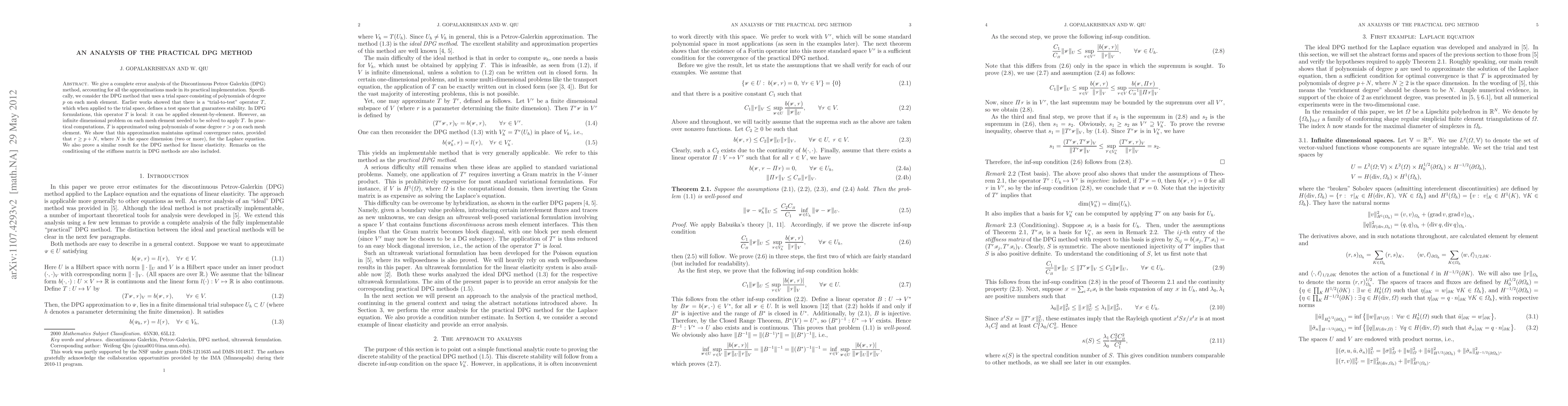 This paper provides an error analysis of the practical Discontinuous Petrov-Galerkin (DPG) method, demonstrating that approximating the "trial-to-test" operator with polynomials of degree $r > p$ on each mesh element maintains optimal convergence rates if $r \ge p+N$, where $N$ is the space dimension. The analysis extends to the DPG method for linear elasticity and includes remarks on the stiffness matrix conditioning.
