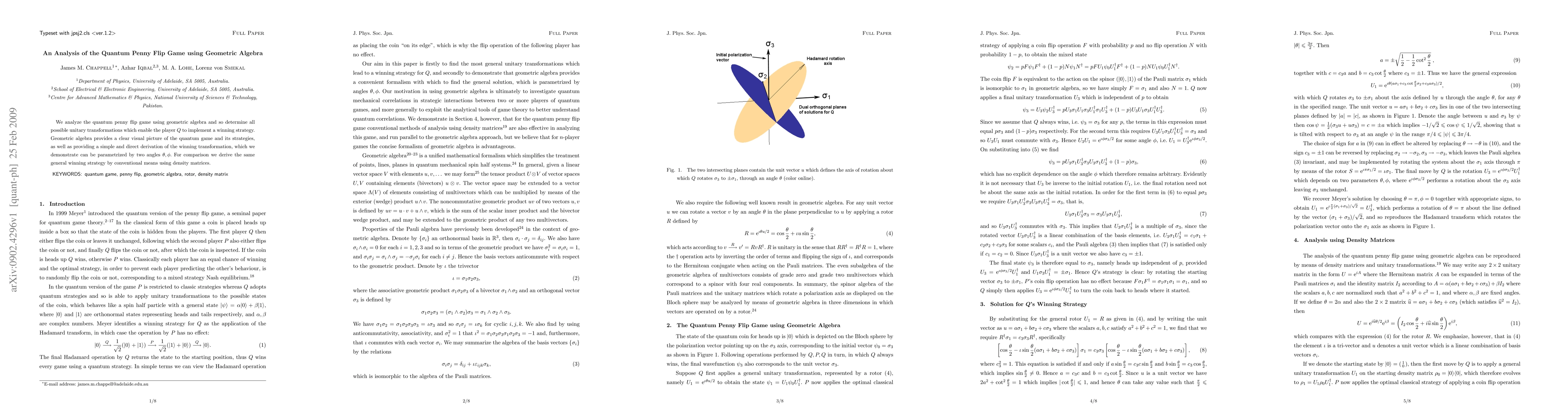 This paper analyzes the quantum penny flip game using geometric algebra to determine all unitary transformations allowing player Q to win, demonstrating a visual and simplified derivation compared to conventional density matrix methods. The winning strategy is shown to be parametrized by two angles.