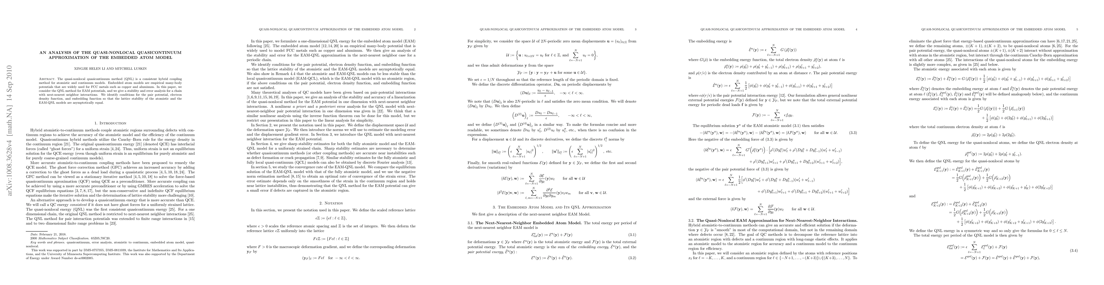 The quasi-nonlocal quasicontinuum method (QNL) is a consistent hybrid coupling method for atomistic and continuum models. Embedded atom models are empirical many-body potentials that are widely used for FCC metals such as copper and aluminum. In this paper, we consider the QNL method for EAM potentials, and we give a stability and error analysis for a chain with next-nearest neighbor interactions. We identify conditions for the pair potential, electron density function, and embedding function so that the lattice stability of the atomistic and the EAM-QNL models are asymptotically equal.