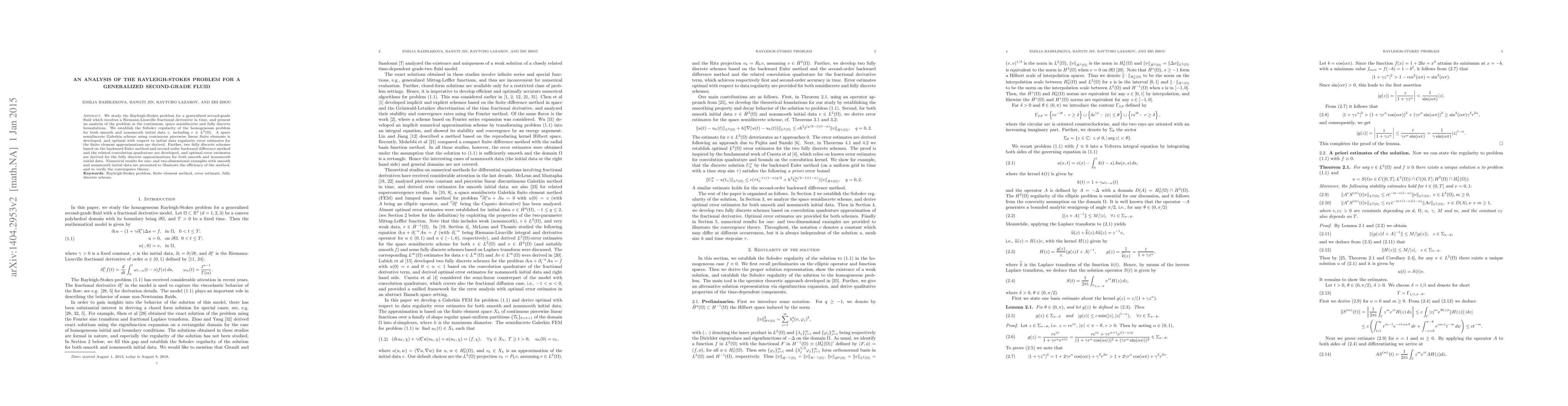 This research analyzes the Rayleigh-Stokes problem for generalized second-grade fluids using fractional derivatives, presenting solutions in continuous, semidiscrete, and fully discrete forms. It establishes Sobolev regularity for smooth and nonsmooth initial data, develops finite element schemes with error estimates, and validates findings through numerical examples in 1D and 2D.