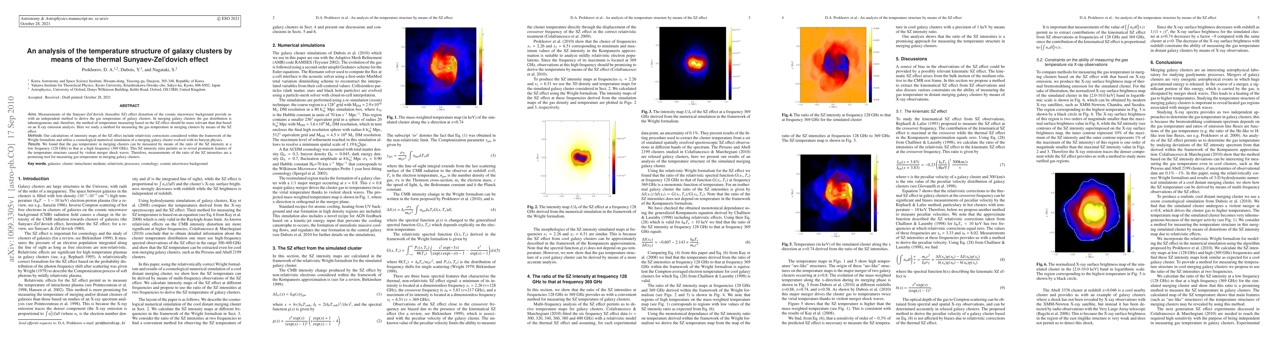 This paper analyzes the thermal Sunyaev-Zel'dovich (SZ) effect to measure gas temperature in merging galaxy clusters, finding that the ratio of SZ intensities at 128 GHz and 369 GHz reveals significant temperature structure features caused by merger shock waves. The study uses relativistic corrections and cosmological simulations to validate this method.
