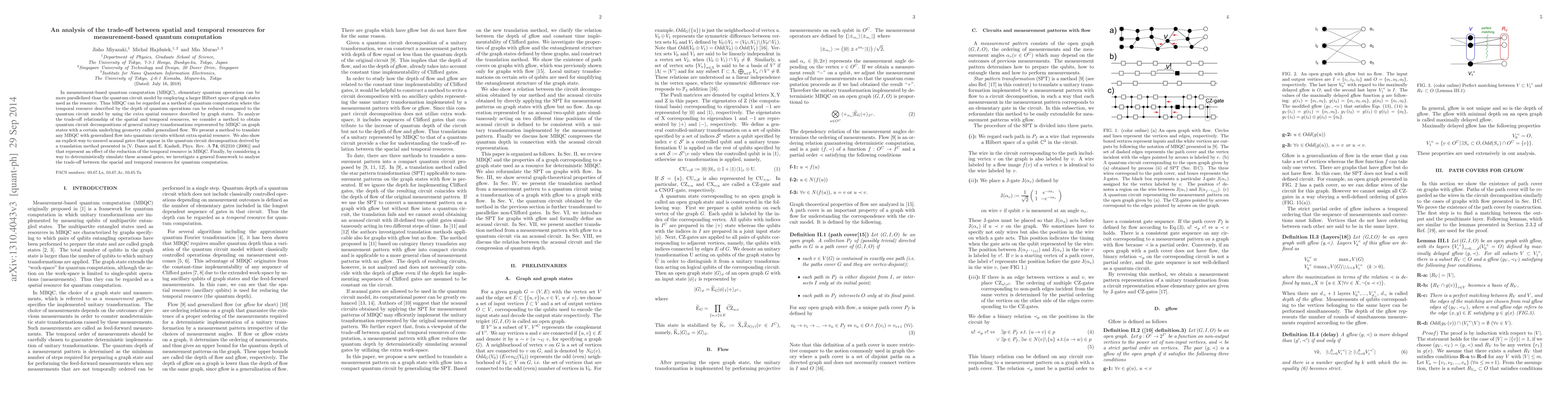In measurement-based quantum computation (MBQC), elementary quantum operations can be more parallelized than the quantum circuit model by employing a larger Hilbert space of graph states used as the resource. Thus MBQC can be regarded as a method of quantum computation where the temporal resource described by the depth of quantum operations can be reduced compared to the quantum circuit model by using the extra spatial resource described by graph states. To analyze the trade-off relationship of the spatial and temporal resources, we consider a method to obtain quantum circuit decompositions of general unitary transformations represented by MBQC on graph states with a certain underlying geometry called generalized flow. We present a method to translate any MBQC with generalized flow into quantum circuits without extra spatial resource. We also show an explicit way to unravel acausal gates that appear in the quantum circuit decomposition derived by a translation method presented in [V. Danos and E. Kashefi, Phys. Rev. A {\bf 74}, 052310 (2006)] and that represent an effect of the reduction of the temporal resource in MBQC. Finally, by considering a way to deterministically simulate these acausal gates, we investigate a general framework to analyze the trade-off between the spacial and temporal resources for quantum computation.
