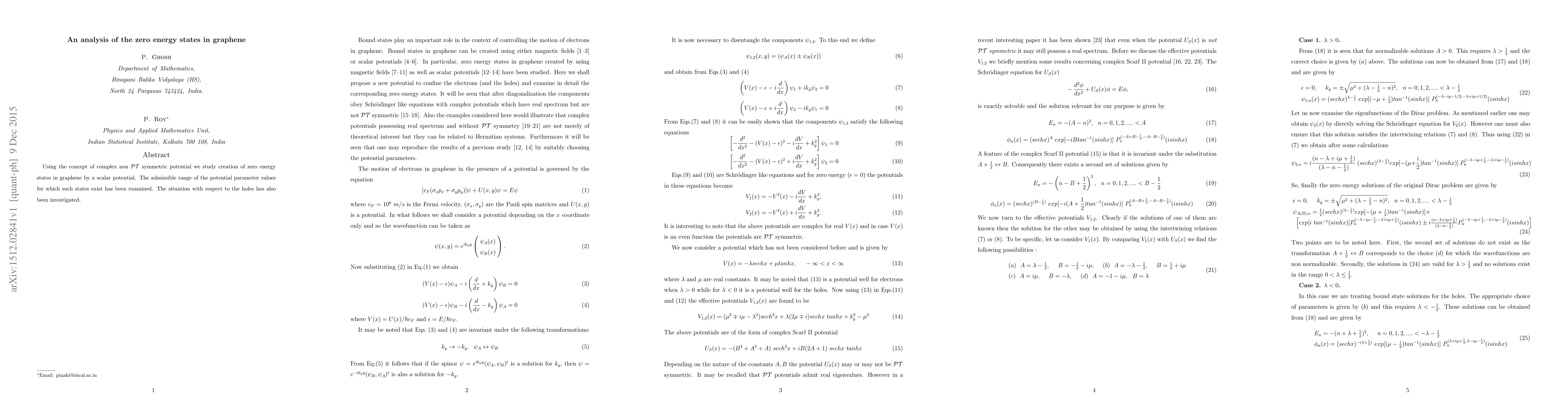 This paper analyzes the emergence of zero energy states in graphene through complex non PT symmetric potentials, determining the permissible range of potential parameters for such states and examining the behavior in the context of holes.