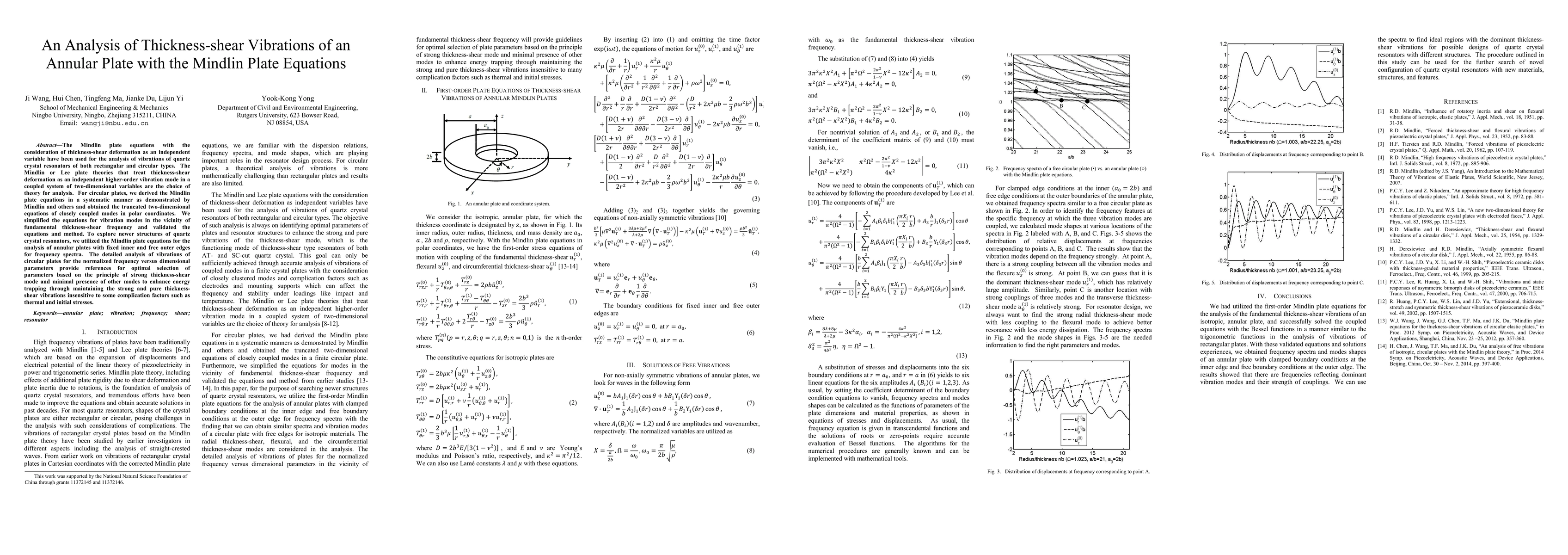 The Mindlin plate equations with the consideration of thickness-shear deformation as an independent variable have been used for the analysis of vibrations of quartz crystal resonators of both rectangular and circular types. The Mindlin or Lee plate theories that treat thickness-shear deformation as an independent higher-order vibration mode in a coupled system of two-dimensional variables are the choice of theory for analysis. For circular plates, we derived the Mindlin plate equations in a systematic manner as demonstrated by Mindlin and others and obtained the truncated two-dimensional equations of closely coupled modes in polar coordinates. We simplified the equations for vibration modes in the vicinity of fundamental thickness-shear frequency and validated the equations and method. To explore newer structures of quartz crystal resonators, we utilized the Mindlin plate equations for the analysis of annular plates with fixed inner and free outer edges for frequency spectra. The detailed analysis of vibrations of circular plates for the normalized frequency versus dimensional parameters provide references for optimal selection of parameters based on the principle of strong thickness-shear mode and minimal presence of other modes to enhance energy trapping through maintaining the strong and pure thickness-shear vibrations insensitive to some complication factors such as thermal and initial stresses.