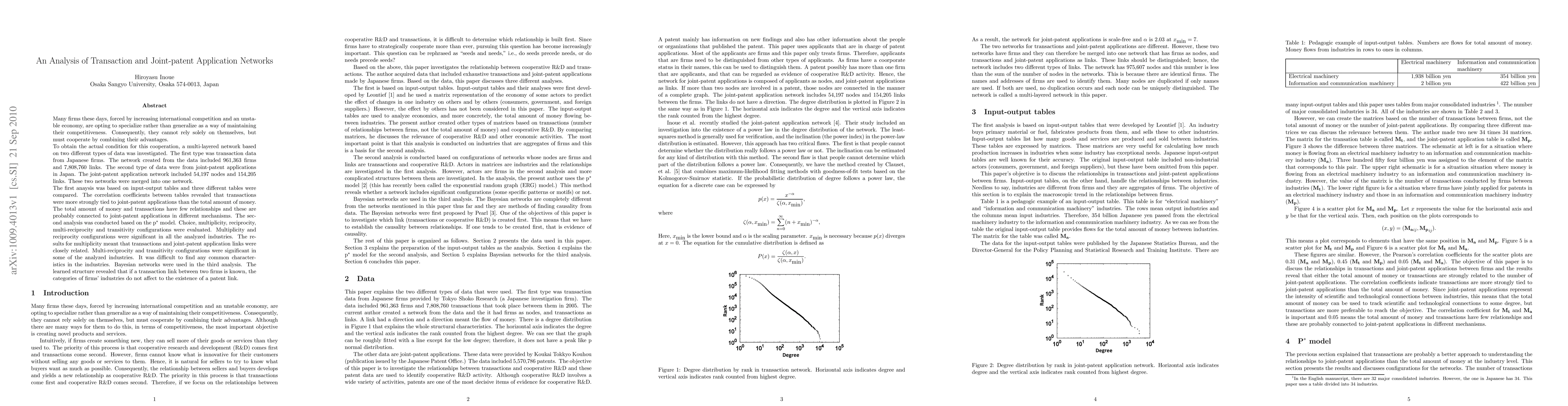 Researchers analyzed two networks of Japanese firms: one based on transaction data and another on joint-patent applications. They found that transactions were more strongly tied to joint-patent applications than monetary relationships, with multiplicity and reciprocity configurations being significant across industries.