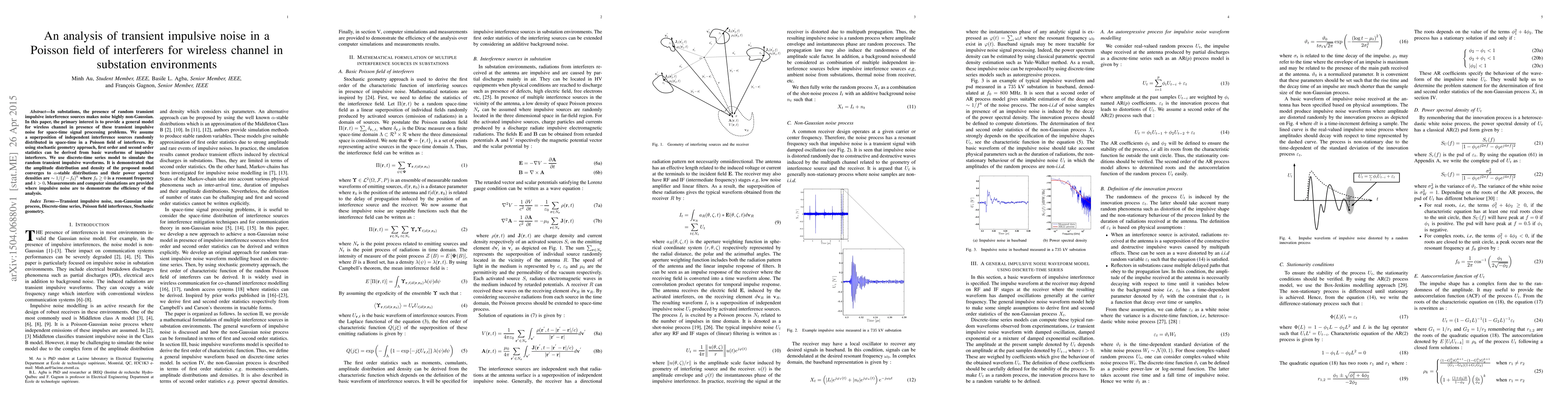 In substations, the presence of random transient impulsive interference sources makes noise highly non-Gaussian. In this paper, the primary interest is to provide a general model for wireless channel in presence of these transient impulsive noise for space-time signal processing problems. We assume a superposition of independent interference sources randomly distributed in space-time in a Poisson field of interferers. By using stochastic geometry approach, first order and second order statistics can be derived from basic waveforms of impulsive interferers. We use discrete-time series model to simulate the random transient impulsive waveforms. It is demonstrated that the amplitude distribution and density of the proposed model converges to $\alpha$-stable distributions and their power spectral densities are $\sim 1/(f-f_{0})^{k}$ where $f_{0}\geq 0$ is a resonant frequency and $k > 0$. Measurements and computer simulations are provided where impulsive noise are to demonstrate the efficiency of the analysis.