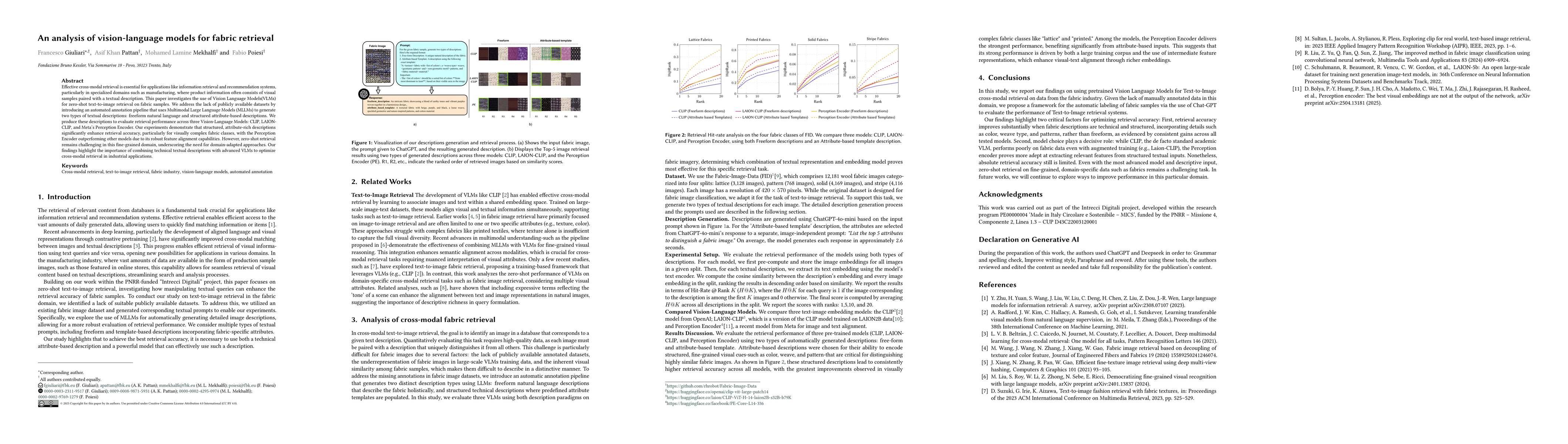 Effective cross-modal retrieval is essential for applications like information retrieval and recommendation systems, particularly in specialized domains such as manufacturing, where product information often consists of visual samples paired with a textual description. This paper investigates the use of Vision Language Models(VLMs) for zero-shot text-to-image retrieval on fabric samples. We address the lack of publicly available datasets by introducing an automated annotation pipeline that uses Multimodal Large Language Models (MLLMs) to generate two types of textual descriptions: freeform natural language and structured attribute-based descriptions. We produce these descriptions to evaluate retrieval performance across three Vision-Language Models: CLIP, LAION-CLIP, and Meta's Perception Encoder. Our experiments demonstrate that structured, attribute-rich descriptions significantly enhance retrieval accuracy, particularly for visually complex fabric classes, with the Perception Encoder outperforming other models due to its robust feature alignment capabilities. However, zero-shot retrieval remains challenging in this fine-grained domain, underscoring the need for domain-adapted approaches. Our findings highlight the importance of combining technical textual descriptions with advanced VLMs to optimize cross-modal retrieval in industrial applications.
