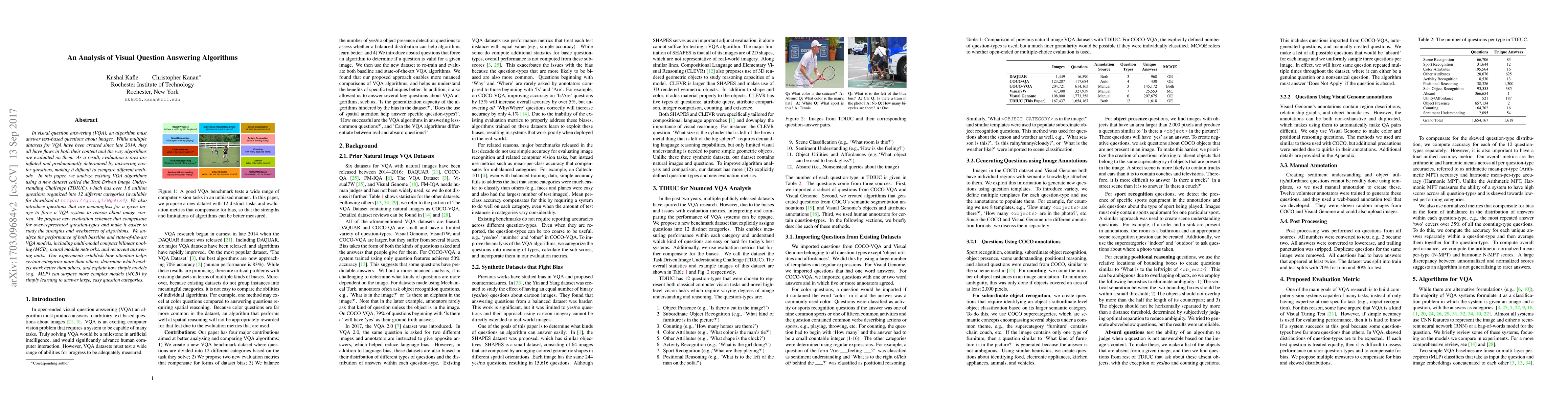 In visual question answering (VQA), an algorithm must answer text-based questions about images. While multiple datasets for VQA have been created since late 2014, they all have flaws in both their content and the way algorithms are evaluated on them. As a result, evaluation scores are inflated and predominantly determined by answering easier questions, making it difficult to compare different methods. In this paper, we analyze existing VQA algorithms using a new dataset. It contains over 1.6 million questions organized into 12 different categories. We also introduce questions that are meaningless for a given image to force a VQA system to reason about image content. We propose new evaluation schemes that compensate for over-represented question-types and make it easier to study the strengths and weaknesses of algorithms. We analyze the performance of both baseline and state-of-the-art VQA models, including multi-modal compact bilinear pooling (MCB), neural module networks, and recurrent answering units. Our experiments establish how attention helps certain categories more than others, determine which models work better than others, and explain how simple models (e.g. MLP) can surpass more complex models (MCB) by simply learning to answer large, easy question categories.