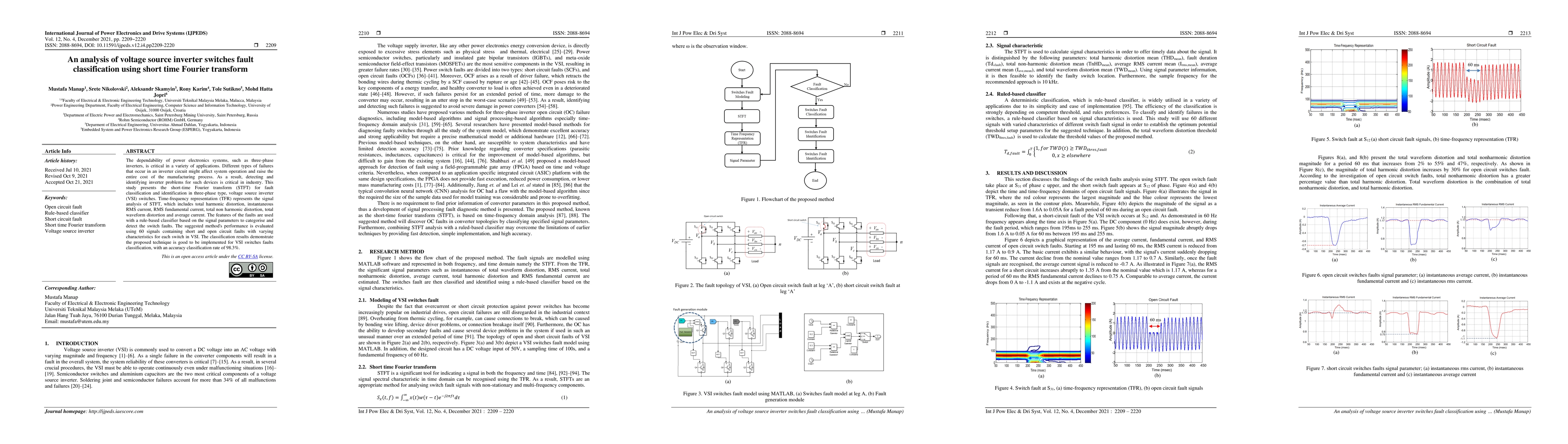 This paper proposes using short-time Fourier transform (STFT) for fault classification in three-phase voltage source inverter (VSI) switches, employing time-frequency representation to analyze signal features. The method achieves a high accuracy of 98.3% in detecting and categorizing switch faults, demonstrating its potential for industrial applications.
