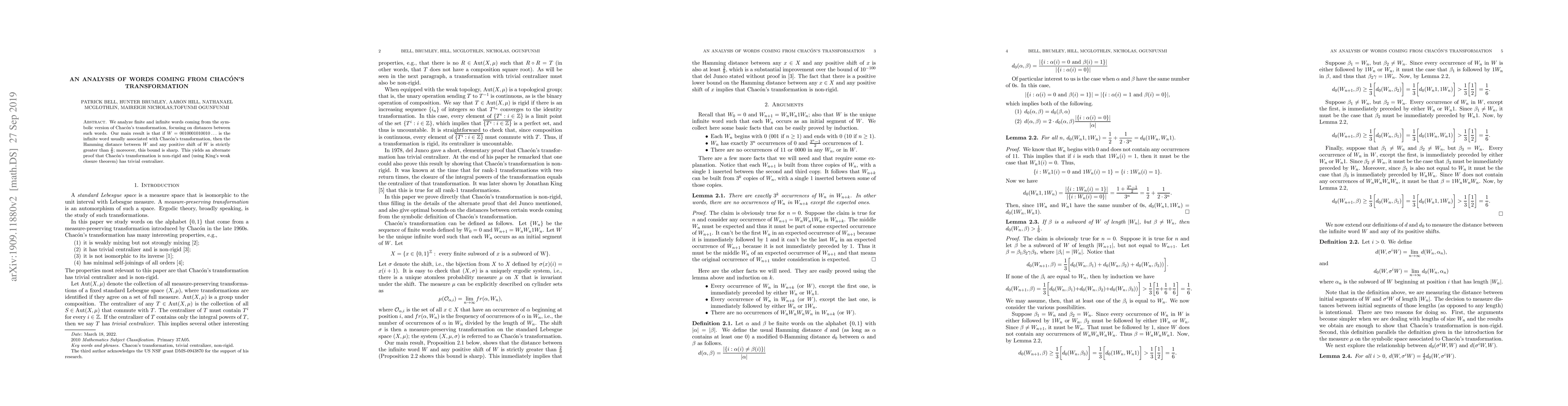 We analyze finite and infinite words coming from the symbolic version of Chacon's transformation, focusing on distances between such words. Our main result is that if W = 0010 0010 1 0010 ... is the infinite word usually associated with Chacon's transformation, then the Hamming distance between W and any positive shift of W is strictly greater than 2/9; moreover, this bound is sharp. This yields an alternate proof that Chacon's transformation is non-rigid and (using King's weak closure theorem) has trivial centralizer.