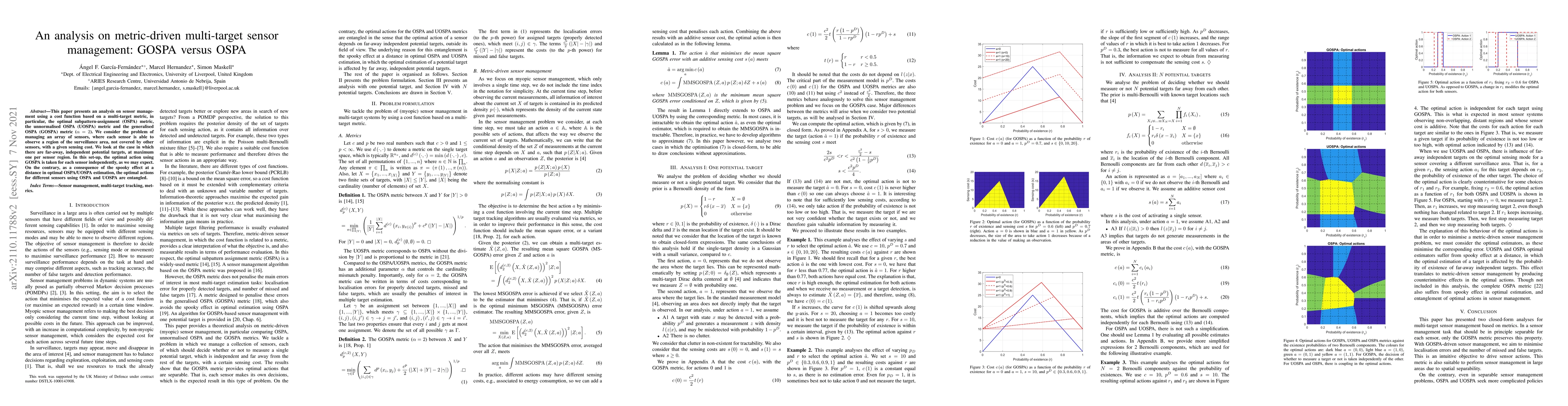This paper presents an analysis on sensor management using a cost function based on a multi-target metric, in particular, the optimal subpattern-assignment (OSPA) metric, the unnormalised OSPA (UOSPA) metric and the generalised OSPA (GOSPA) metric (\alpha=2). We consider the problem of managing an array of sensors, where each sensor is able to observe a region of the surveillance area, not covered by other sensors, with a given sensing cost. We look at the case in which there are far-away, independent potential targets, at maximum one per sensor region. In this set-up, the optimal action using GOSPA is taken for each sensor independently, as we may expect. On the contrary, as a consequence of the spooky effect at a distance in optimal OSPA/UOSPA estimation, the optimal actions for different sensors using OSPA and UOSPA are entangled.