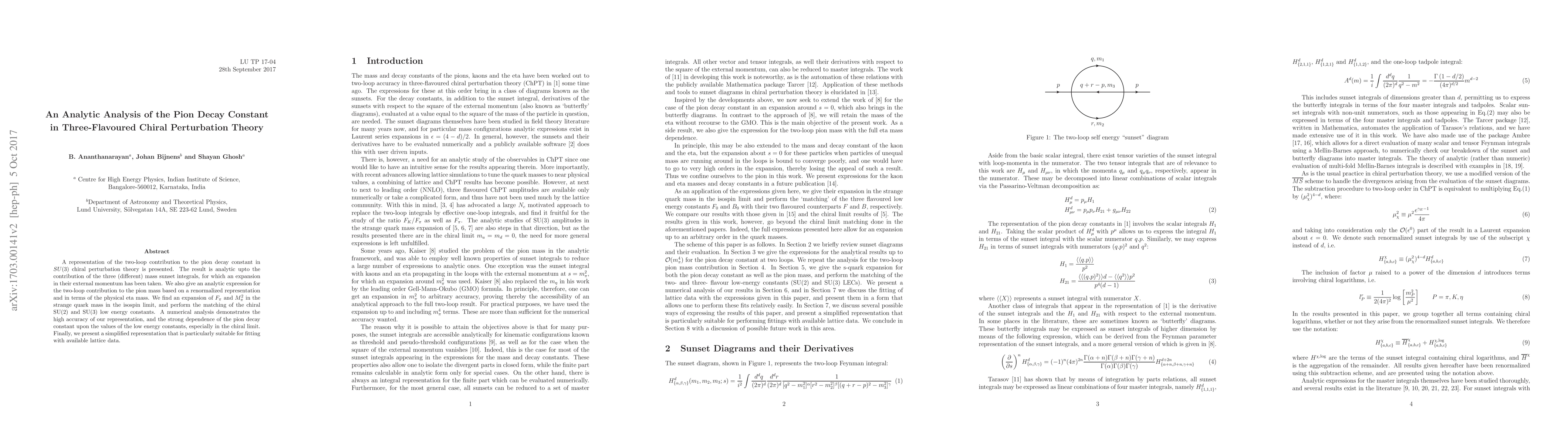 This paper presents an analytic analysis of the pion decay constant in three-flavored chiral perturbation theory, detailing a two-loop contribution representation. It also offers an analytic expression for the pion mass, an expansion in the strange quark mass, and a comparison of chiral SU(2) and SU(3) low energy constants. The study concludes with a simplified representation for lattice data fitting, emphasizing the high accuracy and strong dependence of the pion decay constant on low energy constants, particularly in the chiral limit.
