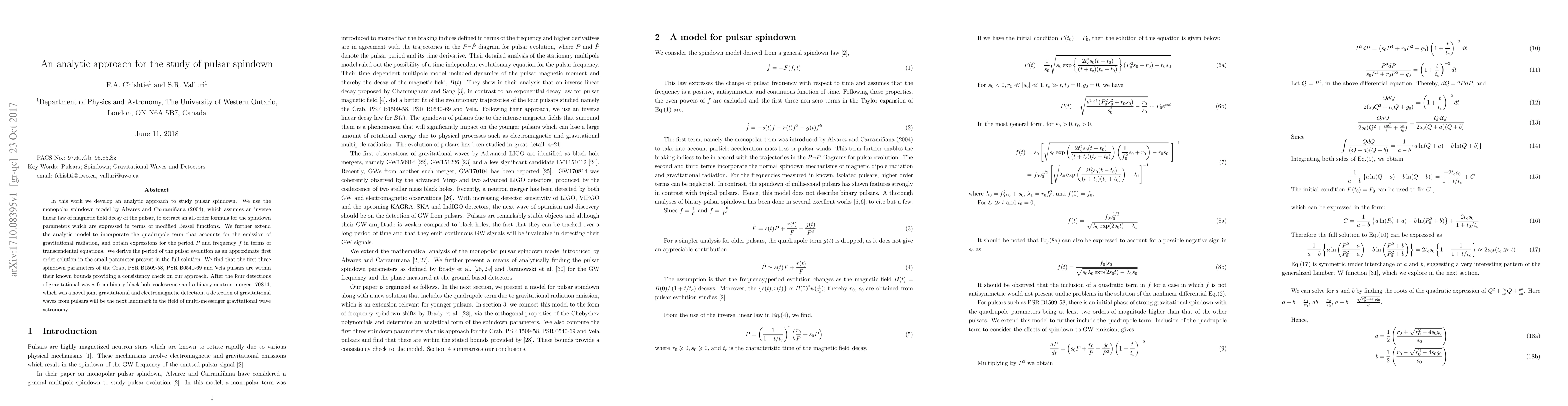 Researchers developed an analytic approach to study pulsar spindown, incorporating a quadrupole term for gravitational radiation and deriving expressions for period and frequency in terms of transcendental equations. The model provides a consistency check on existing data for four pulsars.
