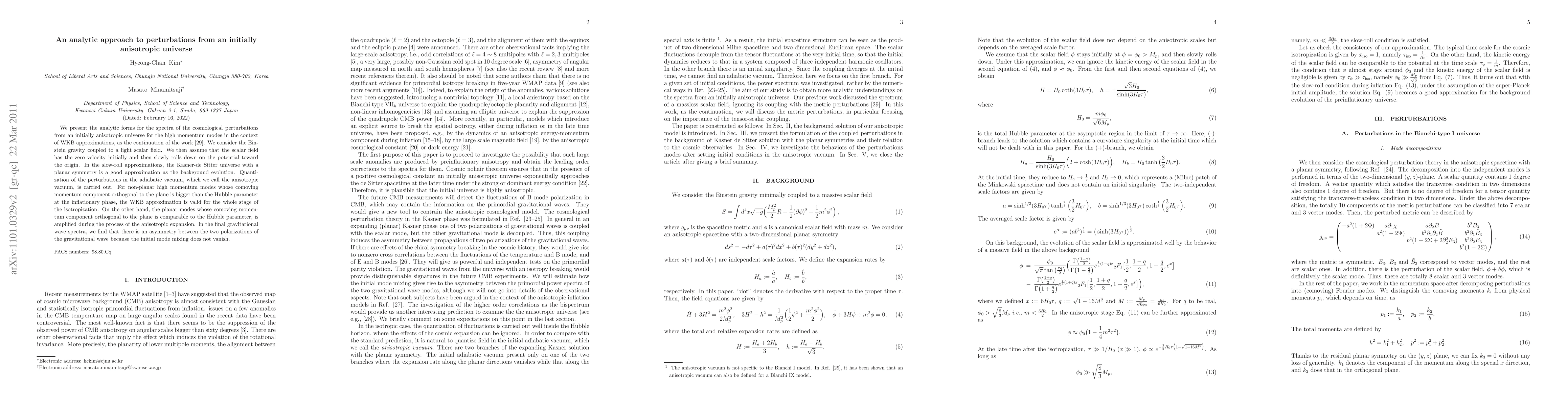 We present the analytic forms for the spectra of the cosmological perturbations from an initially anisotropic universe for the high momentum modes in the context of WKB approximations, as the continuation of the work [29]. We consider the Einstein gravity coupled to a light scalar field. We then assume that the scalar field has the zero velocity initially and then slowly rolls down on the potential toward the origin. In the slow-roll approximations, the Kasner-de Sitter universe with a planar symmetry is a good approximation as the background evolution. Quantization of the perturbations in the adiabatic vacuum, which we call the anisotropic vacuum, is carried out. For non-planar high momentum modes whose comoving momentum component orthogonal to the plane is bigger than the Hubble parameter at the inflationary phase, the WKB approximation is valid for the whole stage of the isotropization. On the other hand, the planar modes whose comoving momentum component orthogonal to the plane is comparable to the Hubble parameter, is amplified during the process of the anisotropic expansion. In the final gravitational wave spectra, we find that there is an asymmetry between the two polarizations of the gravitational wave because the initial mode mixing does not vanish.