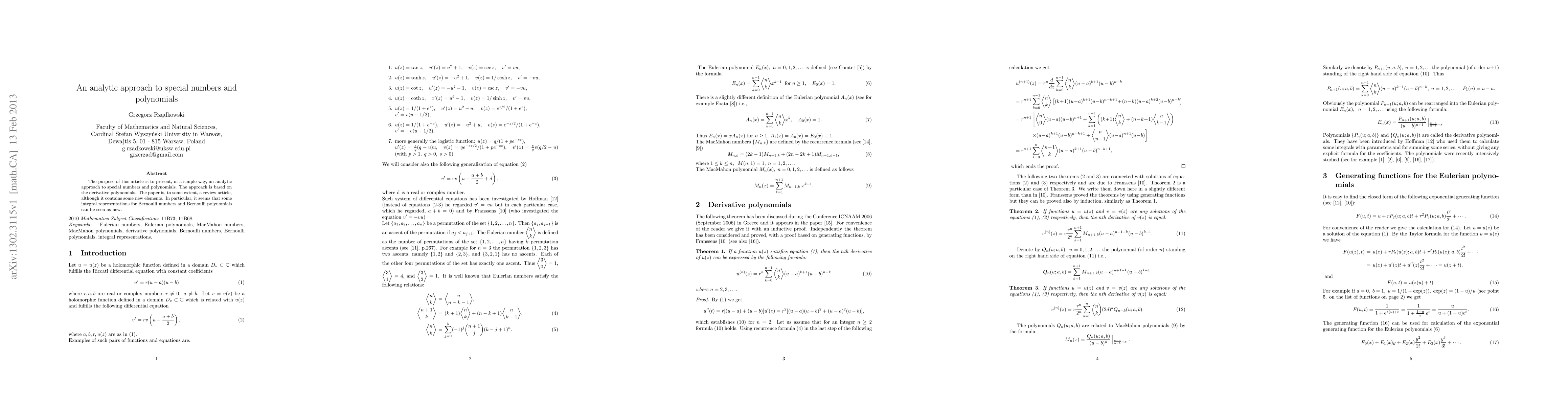 This paper presents an analytic approach to special numbers and polynomials using derivative polynomials, introducing new integral representations for Bernoulli numbers and polynomials.