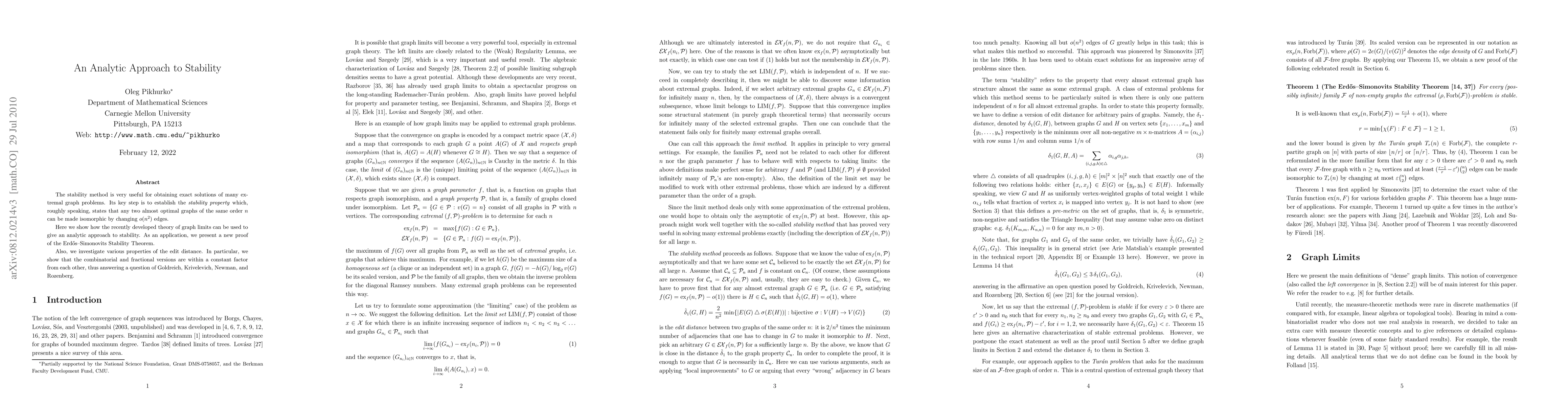 The stability method is very useful for obtaining exact solutions of many extremal graph problems. Its key step is to establish the stability property which, roughly speaking, states that any two almost optimal graphs of the same order $n$ can be made isomorphic by changing o(n^2) edges. Here we show how the recently developed theory of graph limits can be used to give an analytic approach to stability. As an application, we present a new proof of the Erdos-Simonovits Stability Theorem. Also, we investigate various properties of the edit distance. In particular, we show that the combinatorial and fractional versions are within a constant factor from each other, thus answering a question of Goldreich, Krivelevich, Newman, and Rozenberg.