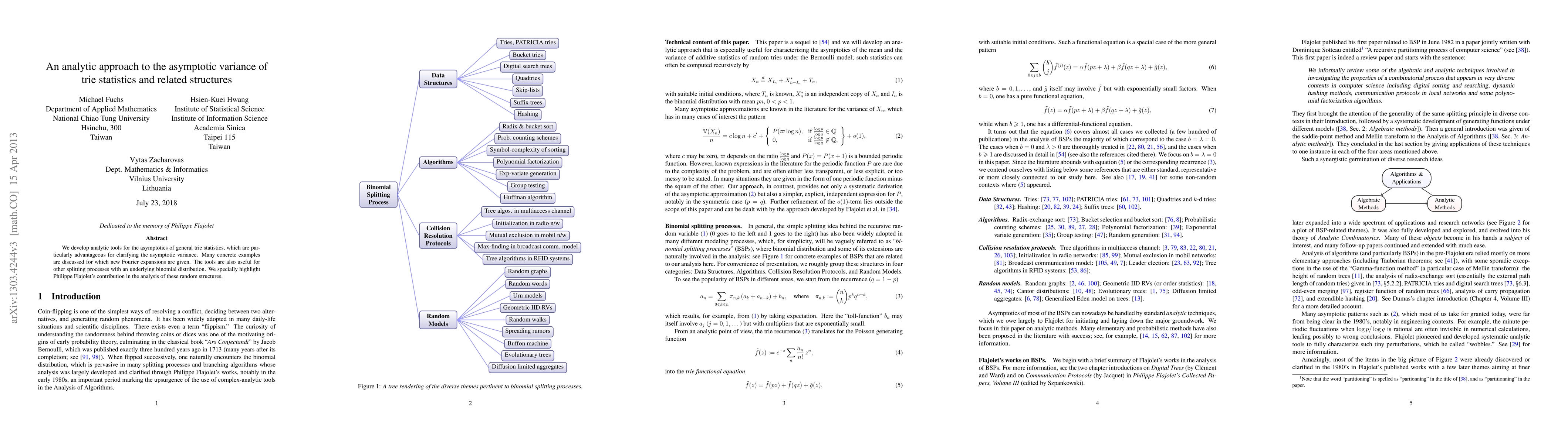 We develop analytic tools for the asymptotics of general trie statistics, which are particularly advantageous for clarifying the asymptotic variance. Many concrete examples are discussed for which new Fourier expansions are given. The tools are also useful for other splitting processes with an underlying binomial distribution. We specially highlight Philippe Flajolet's contribution in the analysis of these random structures.
