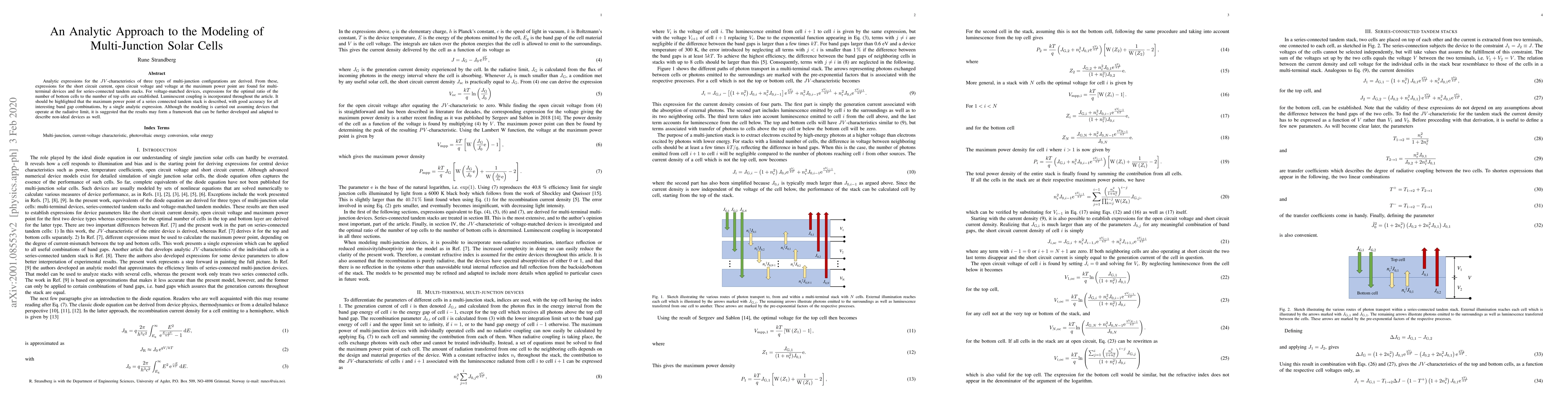 Researchers developed an analytic approach to model multi-junction solar cells, finding expressions for key performance metrics like short circuit current and maximum power point, with potential applications beyond idealized devices.