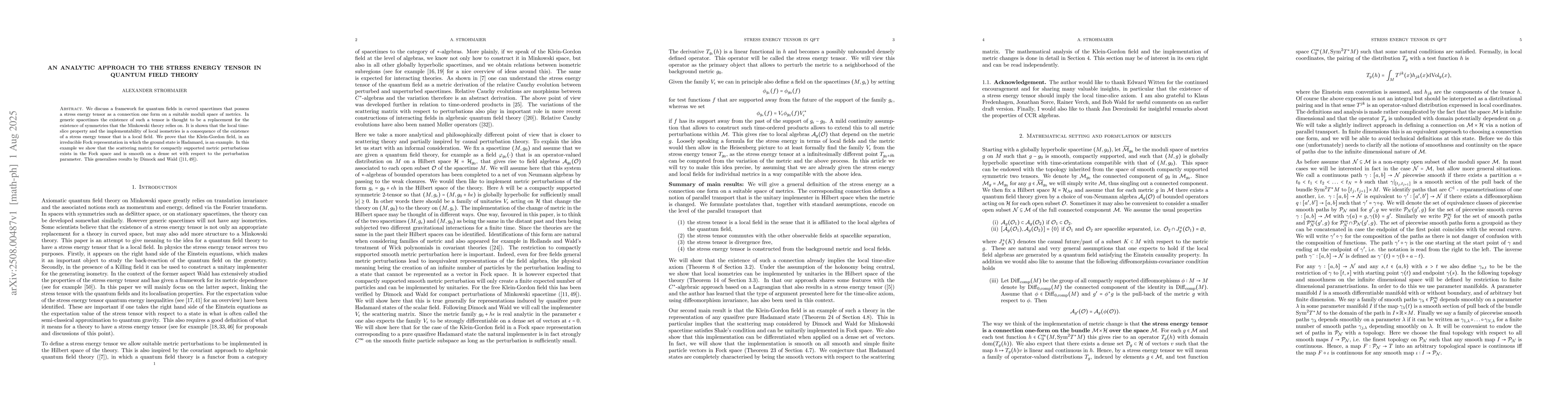We discuss a framework for quantum fields in curved spacetimes that possess a stress energy tensor as a connection one form on a suitable moduli space of metrics. In generic spacetimes the existence of such a tensor is thought to be a replacement for the existence of symmetries that the Minkowski theory relies on. It is shown that the local time-slice property and the implementability of local isometries is a consequence of the existence of a stress energy tensor that is a local field. We prove that the Klein-Gordon field, in an irreducible Fock representation in which the ground state is Hadamard, is an example. In this example we show that the scattering matrix for compactly supported metric perturbations exists in the Fock space and is smooth on a dense set with respect to the perturbation parameter. This generalises results by Dimock and Wald.
