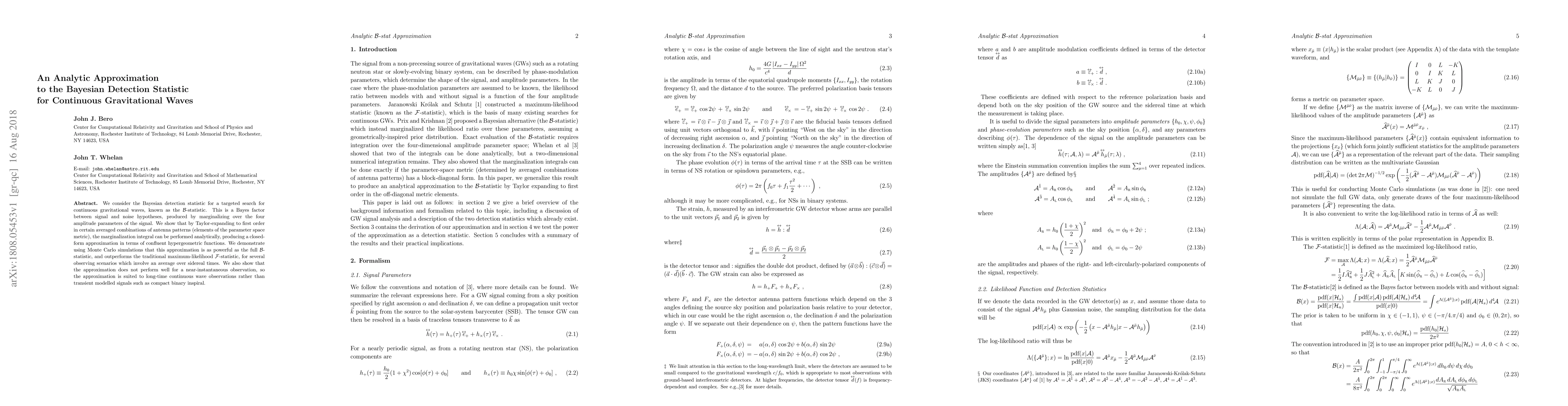 This paper presents an analytic approximation to the Bayesian detection statistic ($\mathcal{B}$-statistic) for continuous gravitational waves, showing it is as powerful as the full statistic in long-time observations. The approximation uses Taylor expansion and confluent hypergeometric functions for analytical integration.