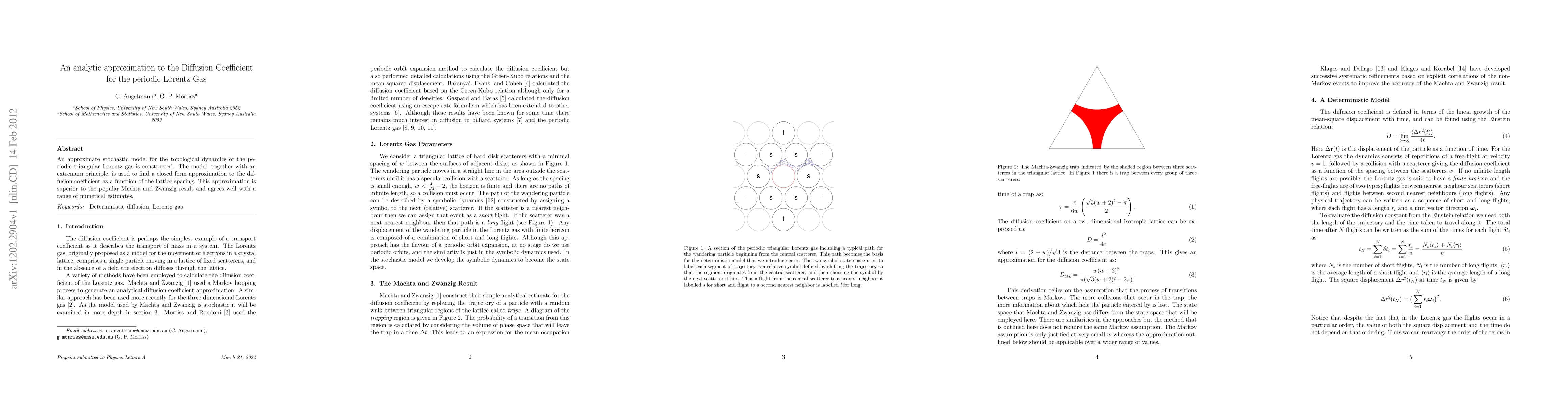 An approximate stochastic model for the topological dynamics of the periodic triangular Lorentz gas is constructed. The model, together with an extremum principle, is used to find a closed form approximation to the diffusion coefficient as a function of the lattice spacing. This approximation is superior to the popular Machta and Zwanzig result and agrees well with a range of numerical estimates.