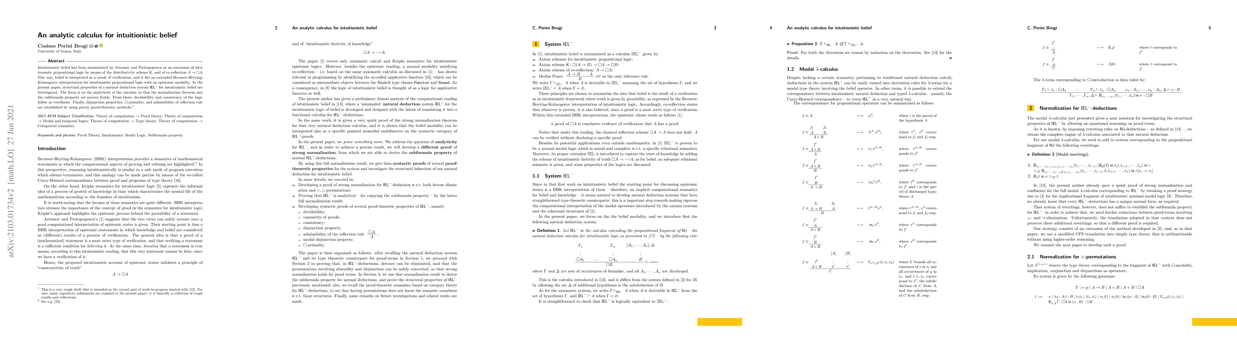 Intuitionistic belief has been axiomatized by Artemov and Protopopescu as an extension of intuitionistic propositional logic by means of the distributivity scheme K, and of co-reflection $A\rightarrow\Box A$. This way, belief is interpreted as a result of verification, and it fits an extended Brouwer-Heyting-Kolmogorov interpretation for intuitionistic propositional logic with an epistemic modality. In the present paper, structural properties of a natural deduction system $\mathsf{IEL}^{-}$ for intuitionistic belief are investigated. The focus is on the analyticity of the calculus, so that the normalization theorem and the subformula property are proven firstly. From these, decidability and consistency of the logic follow as corollaries. Finally, disjunction properties, $\Box$-primality, and admissibility of reflection rule are established by using purely proof-theoretic methods.