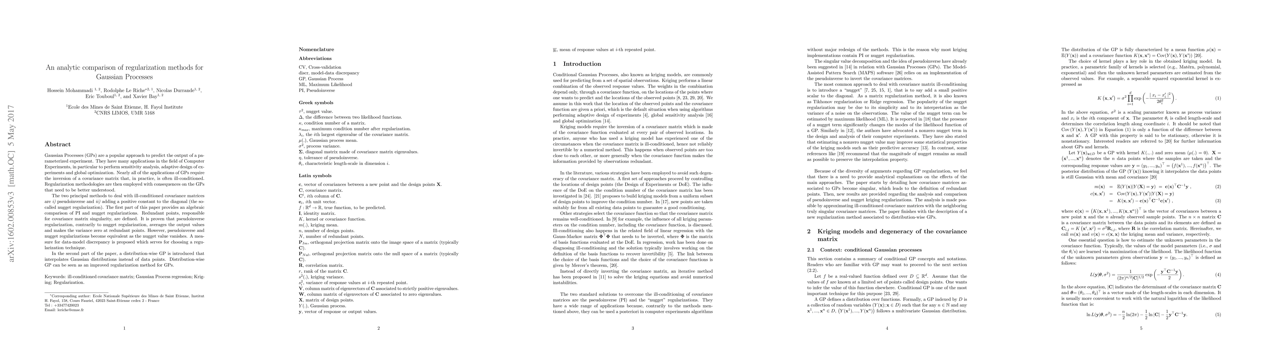 Gaussian Processes (GPs) are a popular approach to predict the output of a parameterized experiment. They have many applications in the field of Computer Experiments, in particular to perform sensitivity analysis, adaptive design of experiments and global optimization. Nearly all of the applications of GPs require the inversion of a covariance matrix that, in practice, is often ill-conditioned. Regularization methodologies are then employed with consequences on the GPs that need to be better understood.The two principal methods to deal with ill-conditioned covariance matrices are i) pseudoinverse and ii) adding a positive constant to the diagonal (the so-called nugget regularization).The first part of this paper provides an algebraic comparison of PI and nugget regularizations. Redundant points, responsible for covariance matrix singularity, are defined. It is proven that pseudoinverse regularization, contrarily to nugget regularization, averages the output values and makes the variance zero at redundant points. However, pseudoinverse and nugget regularizations become equivalent as the nugget value vanishes. A measure for data-model discrepancy is proposed which serves for choosing a regularization technique.In the second part of the paper, a distribution-wise GP is introduced that interpolates Gaussian distributions instead of data points. Distribution-wise GP can be seen as an improved regularization method for GPs.