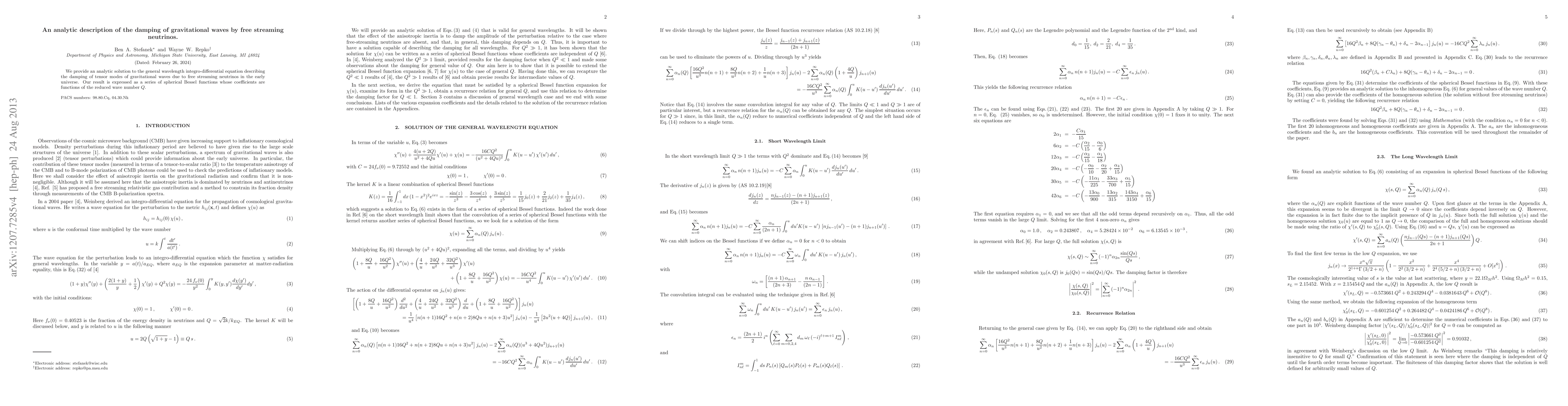 We provide an analytic solution to the general wavelength integro-differential equation describing the damping of tensor modes of gravitational waves due to free streaming neutrinos in the early universe. Our result is expressed as a series of spherical Bessel functions whose coefficients are functions of the reduced wave number $Q$.