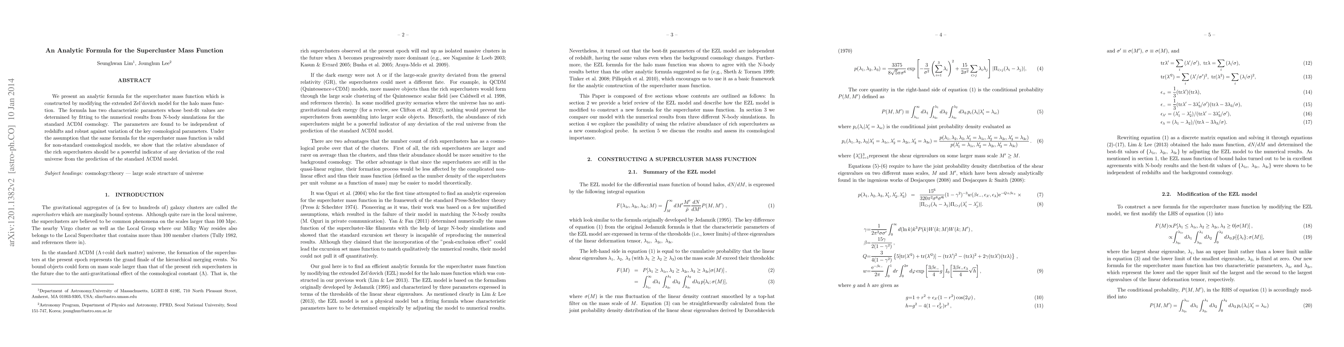 We present an analytic formula for the supercluster mass function which is constructed by modifying the extended Zel'dovich model for the halo mass function. The formula has two characteristic parameters whose best-fit values are determined by fitting to the numerical results from N-body simulations for the standard LambdaCDM cosmology. The parameters are found to be independent of redshifts and robust against variation of the key cosmological parameters. Under the assumption that the same formula for the supercluster mass function is valid for non-standard cosmological models, we show that the relative abundance of the rich superclusters should be a powerful indicator of any deviation of the real universe from the prediction of the standard LambdaCDM model.