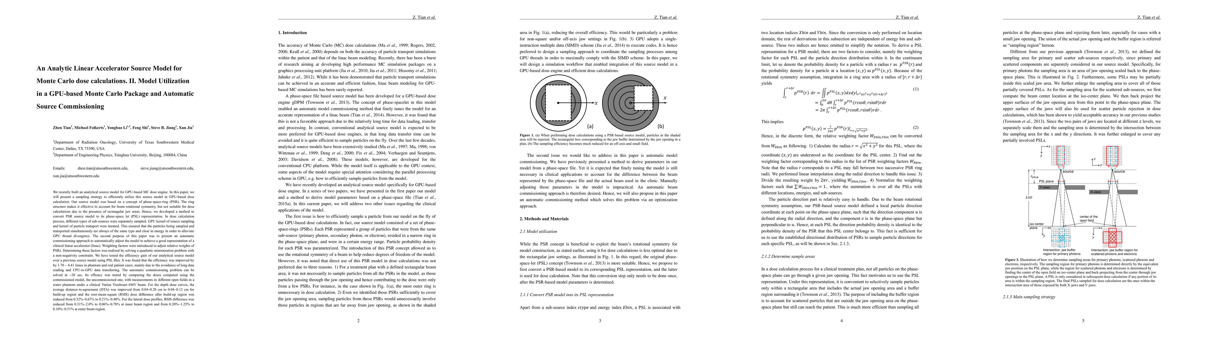 We recently built an analytical source model for GPU-based MC dose engine. In this paper, we present a sampling strategy to efficiently utilize this source model in GPU-based dose calculation. Our source model was based on a concept of phase-space-ring (PSR). This ring structure makes it effective to account for beam rotational symmetry, but not suitable for dose calculations due to rectangular jaw settings. Hence, we first convert PSR source model to its phase-space let (PSL) representation. Then in dose calculation, different types of sub-sources were separately sampled. Source sampling and particle transport were iterated. So that the particles being sampled and transported simultaneously are of same type and close in energy to alleviate GPU thread divergence. We also present an automatic commissioning approach to adjust the model for a good representation of a clinical linear accelerator . Weighting factors were introduced to adjust relative weights of PSRs, determined by solving a quadratic minimization problem with a non-negativity constraint. We tested the efficiency gain of our model over a previous source model using PSL files. The efficiency was improved by 1.70 ~ 4.41, due to the avoidance of long data reading and transferring. The commissioning problem can be solved in ~20 sec. Its efficacy was tested by comparing the doses computed using the commissioned model and the uncommissioned one, with measurements in different open fields in a water phantom under a clinical Varian Truebeam 6MV beam. For the depth dose curves, the average distance-to-agreement was improved from 0.04~0.28 cm to 0.04~0.12 cm for build-up region and the root-mean-square (RMS) dose difference after build-up region was reduced from 0.32%~0.67% to 0.21%~0.48%. For lateral dose profiles, RMS difference was reduced from 0.31%~2.0% to 0.06%~0.78% at inner beam and from 0.20%~1.25% to 0.10%~0.51% at outer beam.
