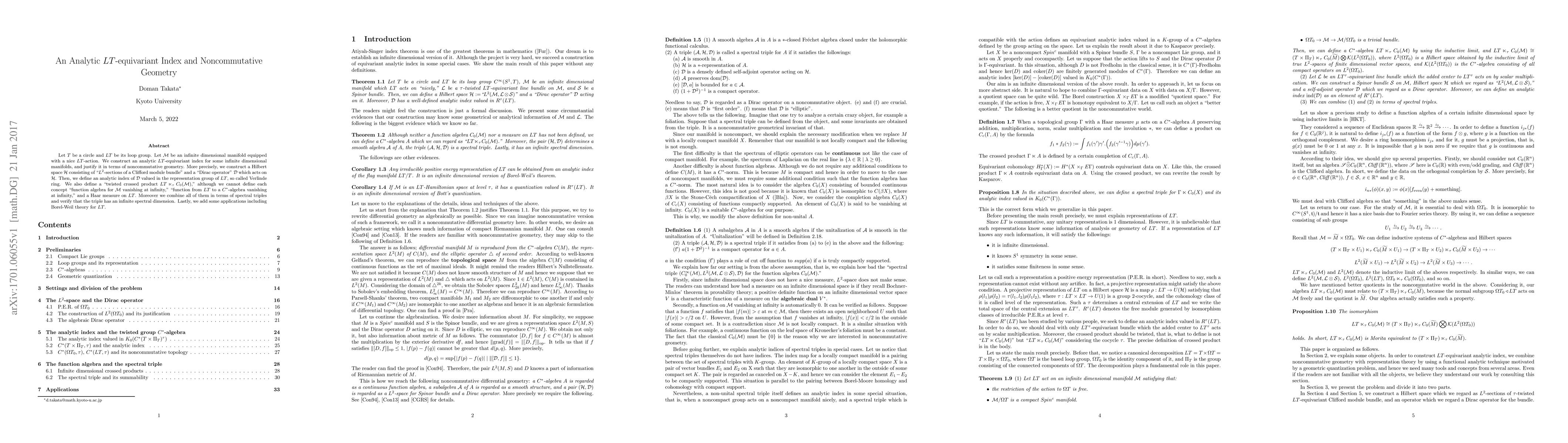 This paper constructs an analytic $LT$-equivariant index for an infinite-dimensional manifold $\mathcal{M}$ with an $LT$-action, justified through noncommutative geometry. It introduces a Hilbert space $\mathcal{H}$ and a Dirac operator $\mathcal{D}$, and defines an index in the Verlinde ring, combining these elements into spectral triples with infinite spectral dimension.