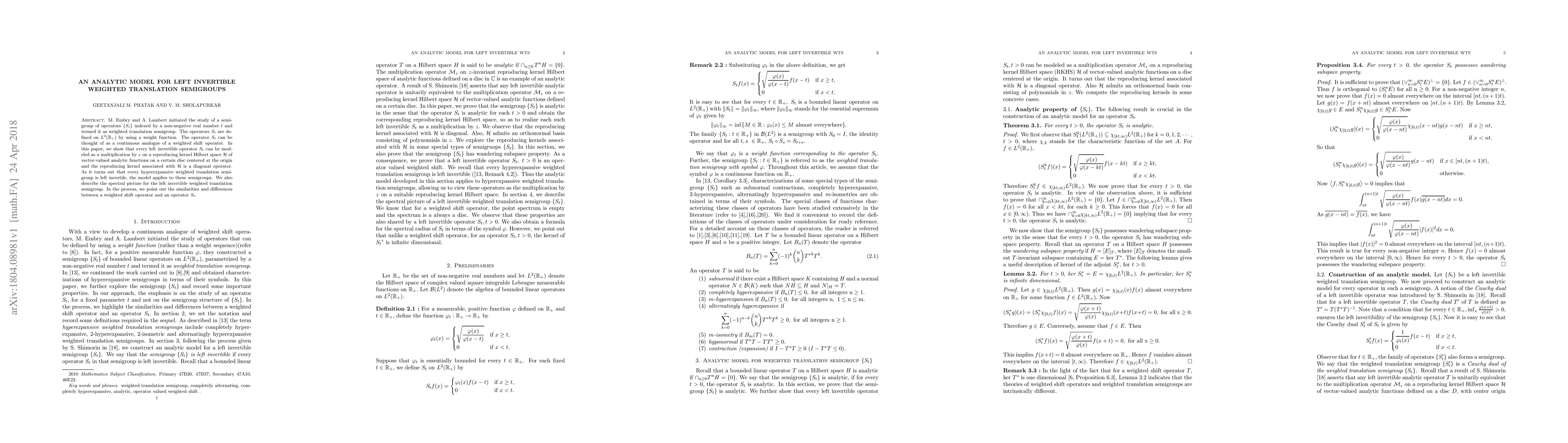 M. Embry and A. Lambert initiated the study of a semigroup of operators $\{S_t\}$ indexed by a non-negative real number $t$ and termed it as weighted translation semigroup. The operators $S_t$ are defined on $L^2(\mathbb R_+)$ by using a weight function. The operator $S_t$ can be thought of as a continuous analogue of a weighted shift operator. In this paper, we show that every left invertible operator $S_t$ can be modeled as a multiplication by $z$ on a reproducing kernel Hilbert space $\cal H$ of vector-valued analytic functions on a certain disc centered at the origin and the reproducing kernel associated with $\cal H$ is a diagonal operator. As it turns out that every hyperexpansive weighted translation semigroup is left invertile, the model applies to these semigroups. We also describe the spectral picture for the left invertible weighted translation semigroup. In the process, we point out the similarities and differences between a weighted shift operator and an operator $S_t.$