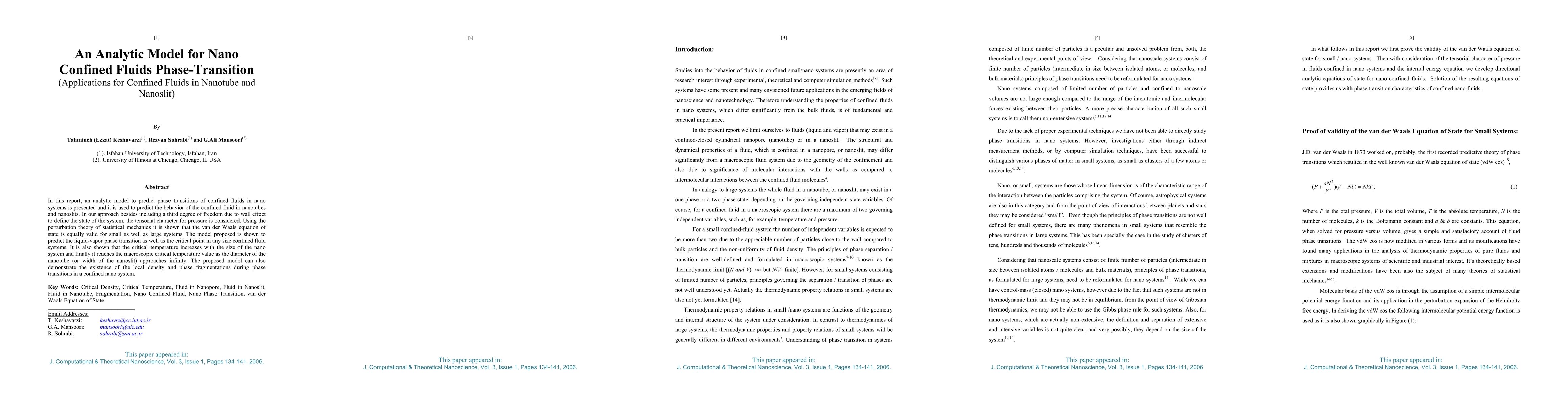 In this report, an analytic model to predict phase transitions of confined fluids in nano systems is presented and it is used to predict the behavior of the confined fluid in nanotubes and nanoslits. In our approach besides including a third degree of freedom due to wall effect to define the state of the system, the tensorial character for pressure is considered. Using the perturbation theory of statistical mechanics it is shown that the van der Waals equation of state is equally valid for small as well as large systems. The model proposed is shown to predict the liquid-vapor phase transition as well as the critical point in any size confined fluid systems. It is also shown that the critical temperature increases with the size of the nano system and finally it reaches the macroscopic critical temperature value as the diameter of the nanotube (or width of the nanoslit) approaches infinity. The proposed model can also demonstrate the existence of the local density and phase fragmentations during phase transitions in a confined nano system.