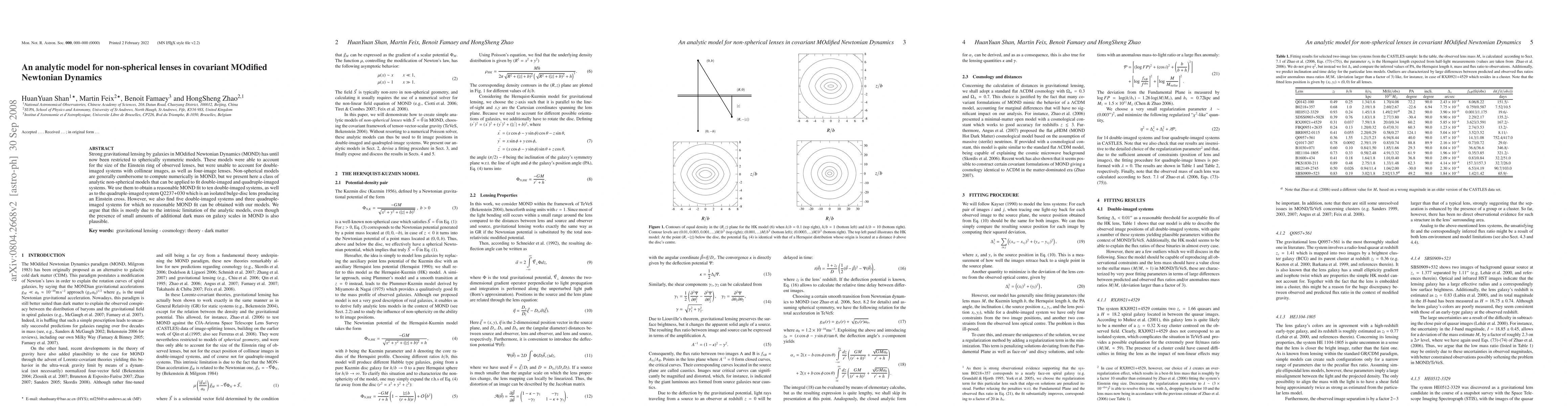 This paper introduces an analytic model for non-spherical lenses in Modified Newtonian Dynamics (MOND) to fit strong lensing systems, successfully fitting ten double-imaged systems and the quadruple-imaged system Q2237+030. However, it identifies limitations in the model for certain systems, suggesting intrinsic model constraints and potential need for additional dark mass.