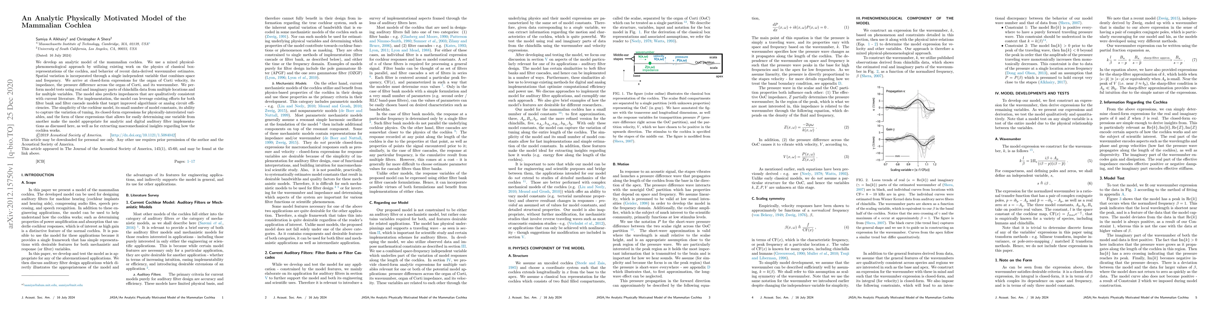 We develop an analytic model of the mammalian cochlea. We use a mixed physical-phenomenological approach by utilizing existing work on the physics of classical box-representations of the cochlea, and behavior of recent data-derived wavenumber estimates. Spatial variation is incorporated through a single independent variable that combines space and frequency. We arrive at closed-form expressions for the organ of Corti velocity, its impedance, the pressure difference across the organ of Corti, and its wavenumber. We perform model tests using real and imaginary parts of chinchilla data from multiple locations and for multiple variables. The model also predicts impedances that are qualitatively consistent with current literature. For implementation, the model can leverage existing efforts for both filter bank and filter cascade models that target improved algorithmic or analog circuit efficiencies. The simplicity of the cochlear model, its small number of model constants, its ability to capture the variation of tuning, its closed-form expressions for physically-interrelated variables, and the form of these expressions that allows for easily determining one variable from another make the model appropriate for analytic and digital auditory filter implementations as discussed here, as well as for extracting macromechanical insights regarding how the cochlea works.