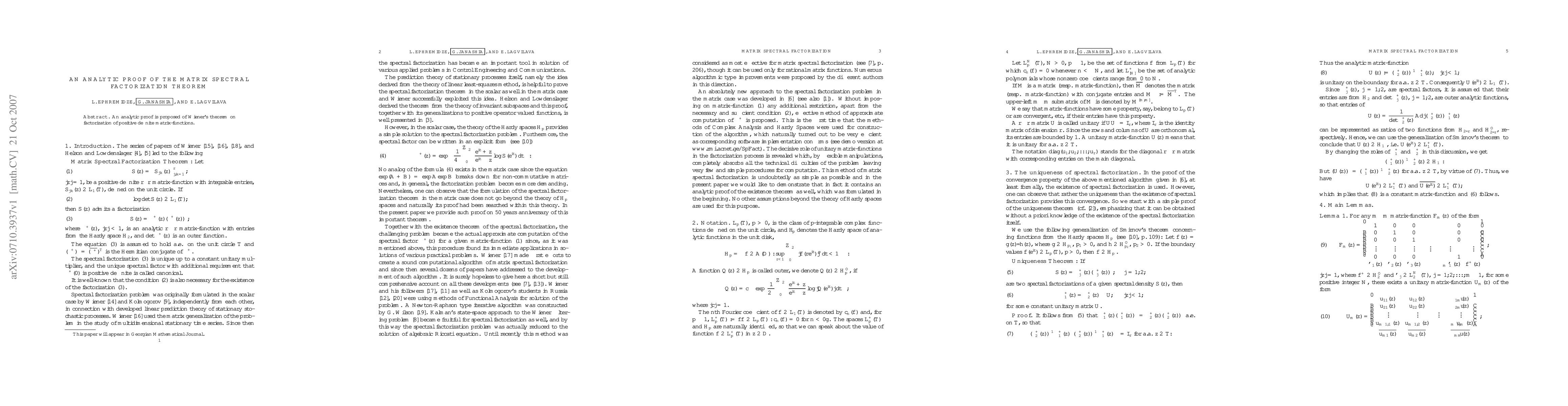 Summary: This paper presents an analytic proof of Wiener's theorem, which addresses the factorization of positive definite matrix-functions, providing a rigorous mathematical foundation for the spectral factorization of matrices.