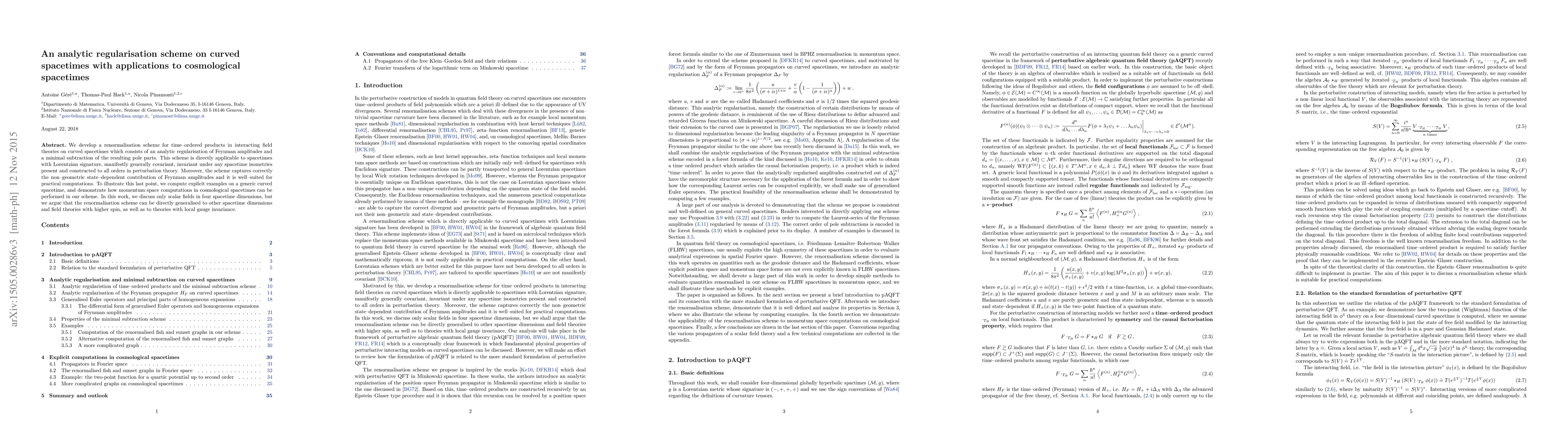 This paper develops a renormalisation scheme for interacting field theories on curved spacetimes, employing an analytic regularisation and minimal subtraction. The scheme is generally covariant, applicable to cosmological spacetimes, and suitable for practical computations, as demonstrated through examples on generic curved spacetimes.