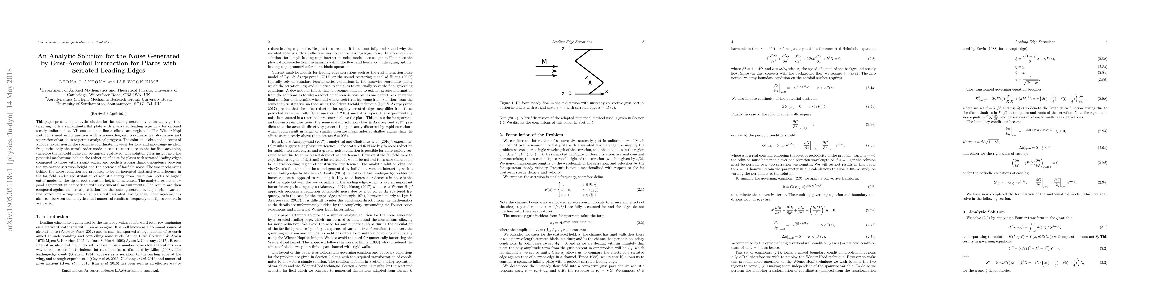 An analytic solution is presented for sound generated by a gust interacting with a semi-infinite flat plate with serrated leading edge, showing reduced noise levels and predicting a logarithmic dependence on serration height.