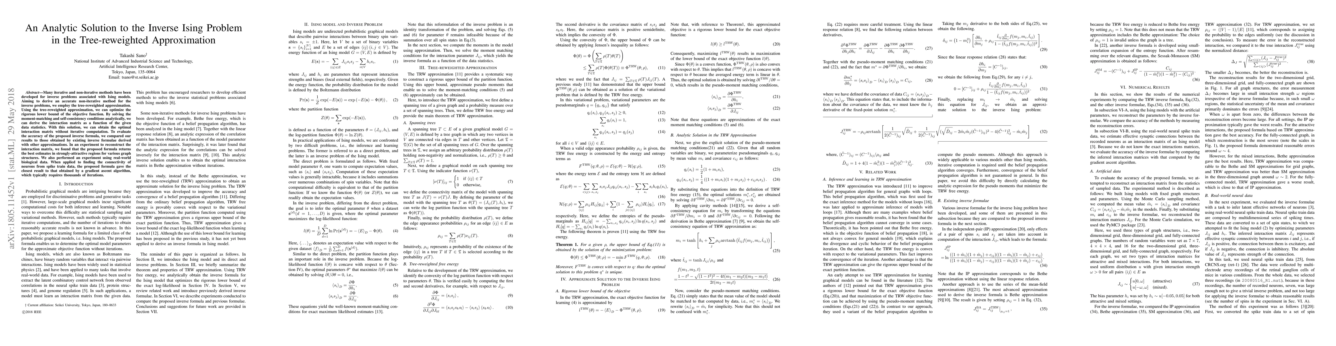 This paper presents an analytic solution for the inverse Ising problem using tree-reweighted approximation, deriving the optimal interaction matrix without iterative computation. The proposed method outperforms existing inverse formulae in reconstructing interaction matrices, especially in strongly-attractive regions, and shows promising results in analyzing real-world biological data.