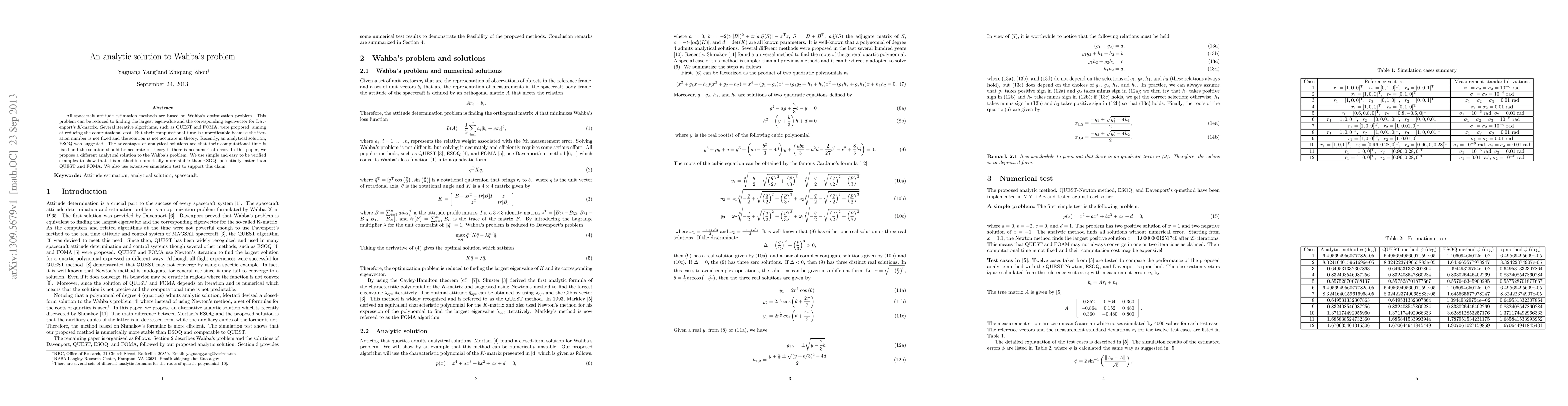 All spacecraft attitude estimation methods are based on Wahba's optimization problem. This problem can be reduced to finding the largest eigenvalue and the corresponding eigenvector for Davenport's $K$-matrix. Several iterative algorithms, such as QUEST and FOMA, were proposed, aiming at reducing the computational cost. But their computational time is unpredictable because the iteration number is not fixed and the solution is not accurate in theory. Recently, an analytical solution, ESOQ was suggested. The advantages of analytical solutions are that their computational time is fixed and the solution should be accurate in theory if there is no numerical error. In this paper, we propose a different analytical solution to the Wahba's problem. We use simple and easy to be verified examples to show that this method is numerically more stable than ESOQ, potentially faster than QUEST and FOMA. We also use extensive simulation test to support this claim.