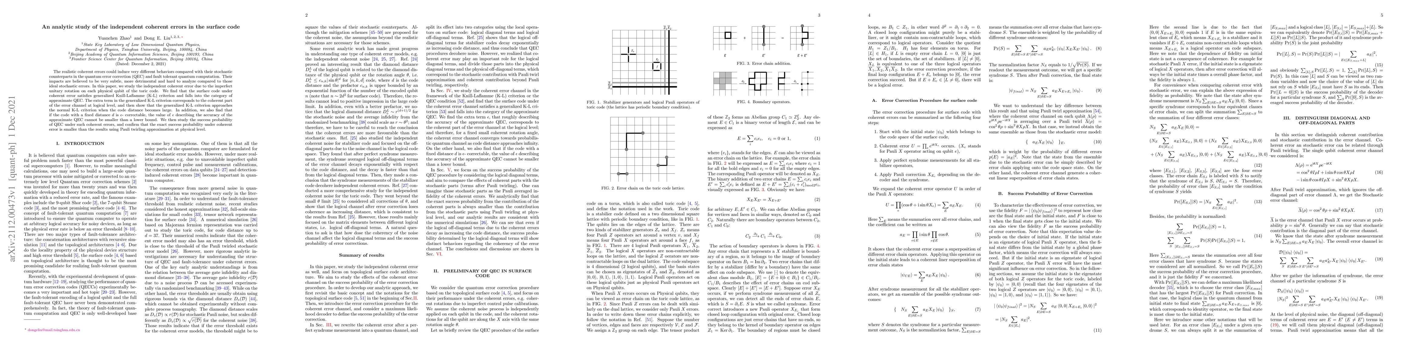 This paper investigates independent coherent errors in the surface code, revealing that they induce different behaviors compared to stochastic errors in quantum error correction. The study shows that the surface code under coherent errors satisfies a generalized Knill-Laflamme criterion, indicating approximate quantum error correction, and finds that the success probability of quantum error correction under coherent errors is lower than that predicted by Pauli twirling approximation.