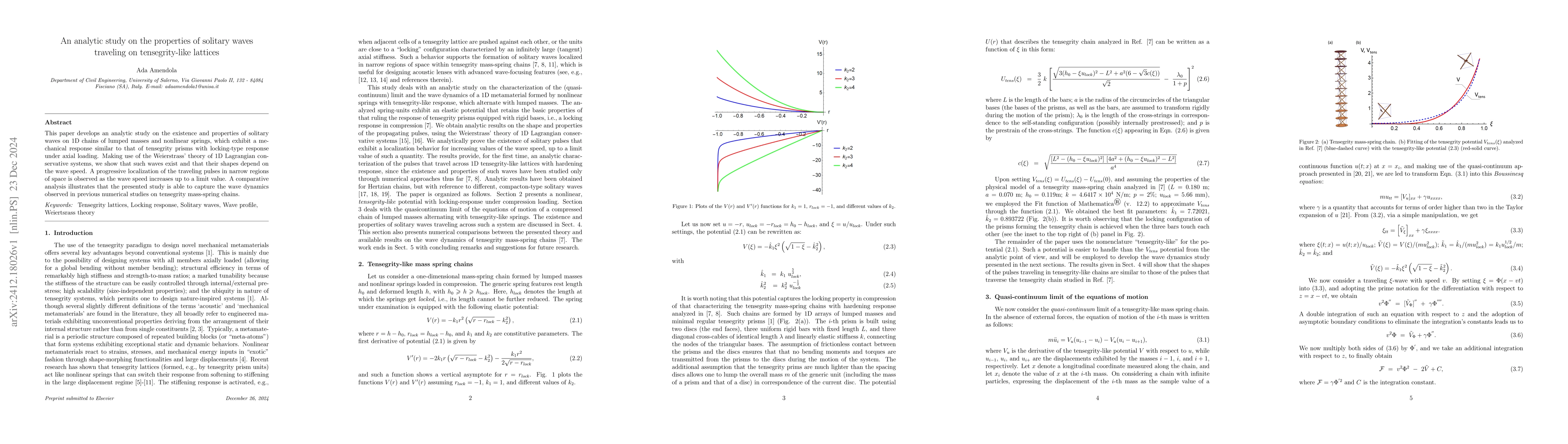 This paper analytically demonstrates the existence of solitary waves on 1D chains of lumped masses and nonlinear springs, akin to tensegrity structures, showing that wave shapes depend on speed and localize progressively at higher speeds. The study aligns with previous numerical observations on tensegrity mass-spring chains.