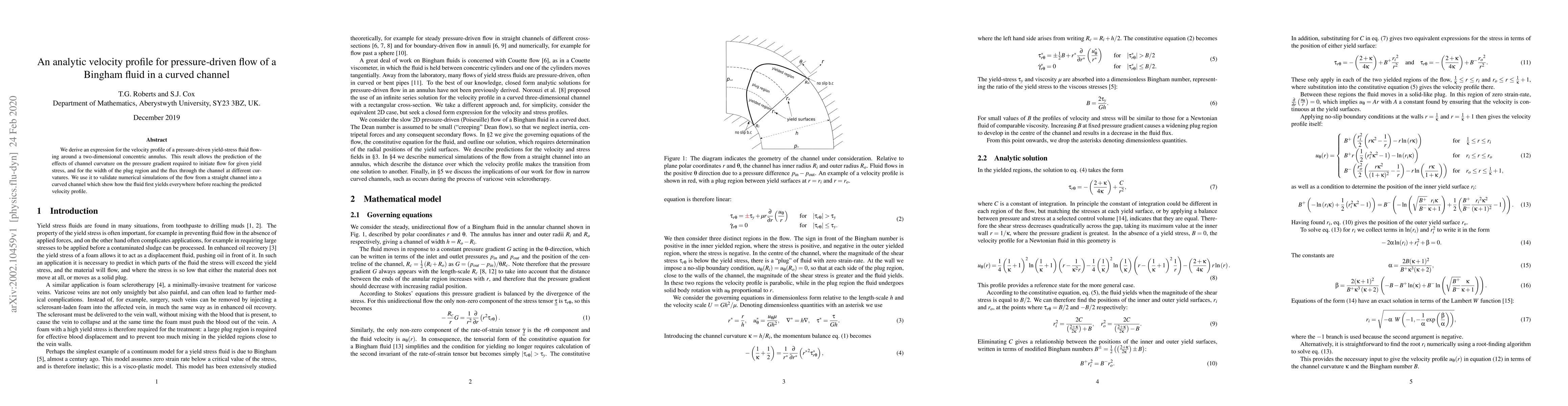 This paper derives an analytic velocity profile for pressure-driven flow of a Bingham fluid in a curved channel, enabling predictions of pressure gradients, plug region width, and flux at various curvatures. It validates numerical simulations showing the fluid's transition from yielding everywhere to a predicted profile.